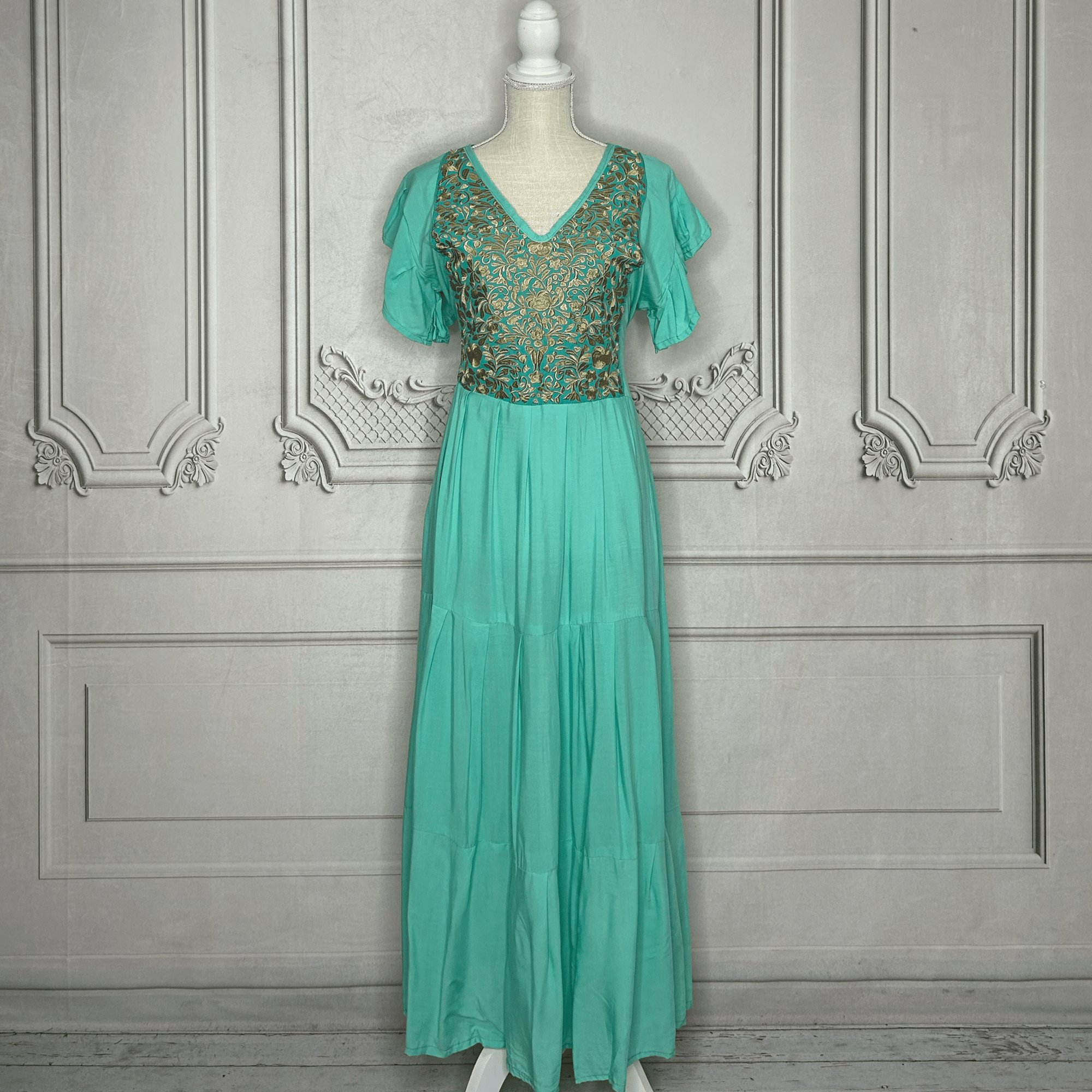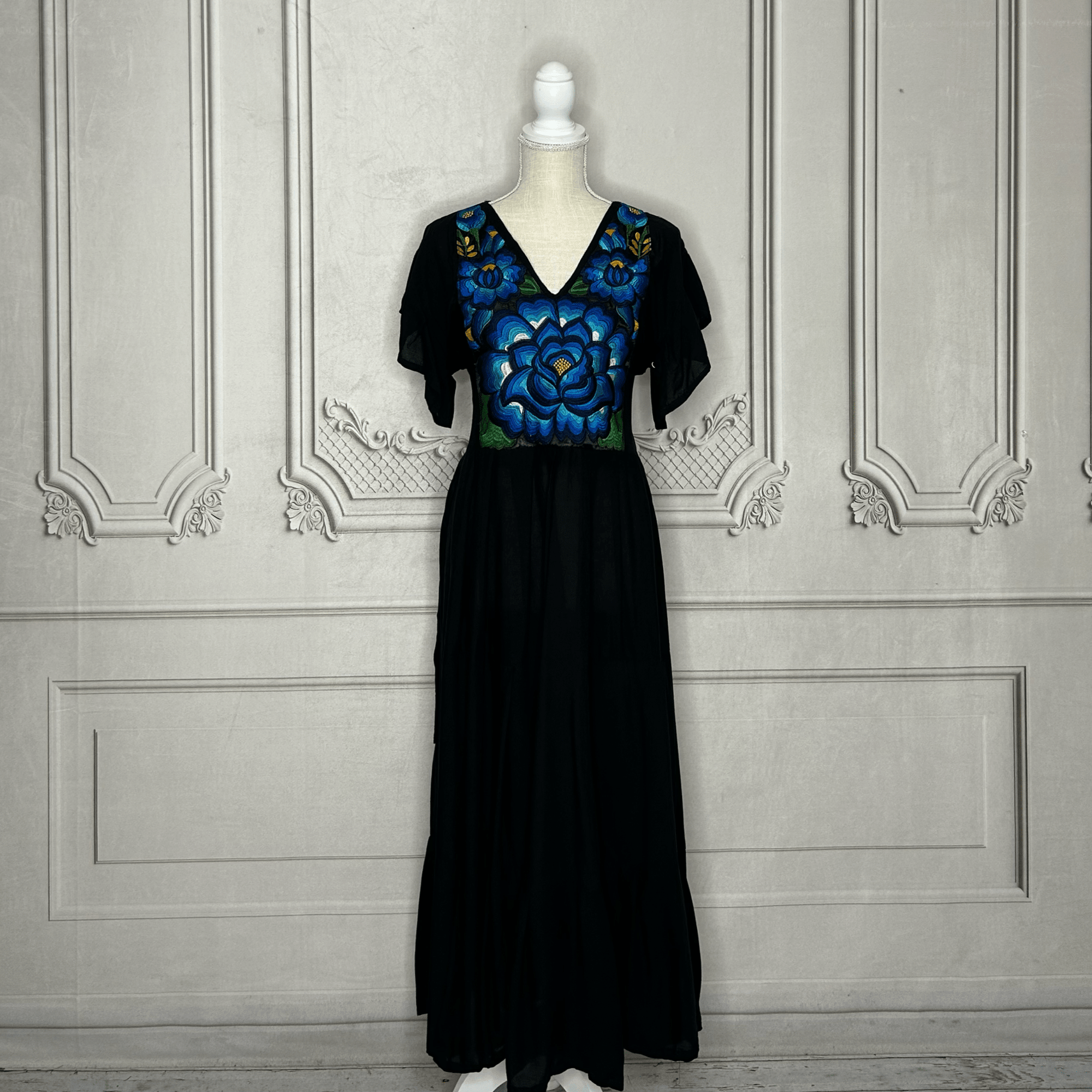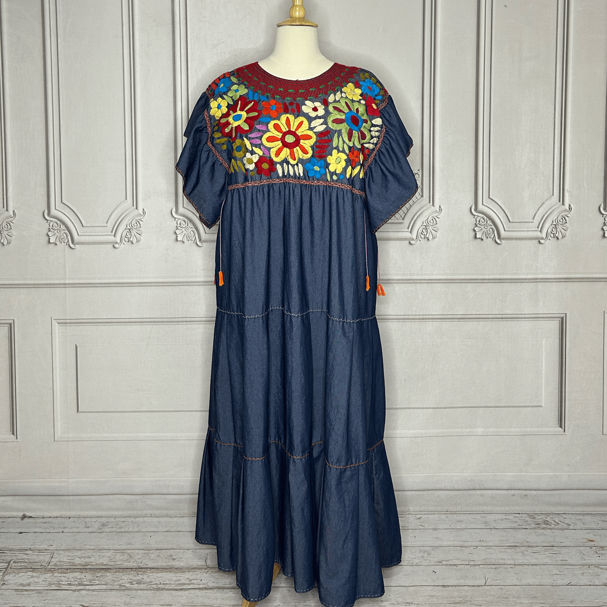 Mexican Embroidered Tiered Denim Maxi Dress - Rosie