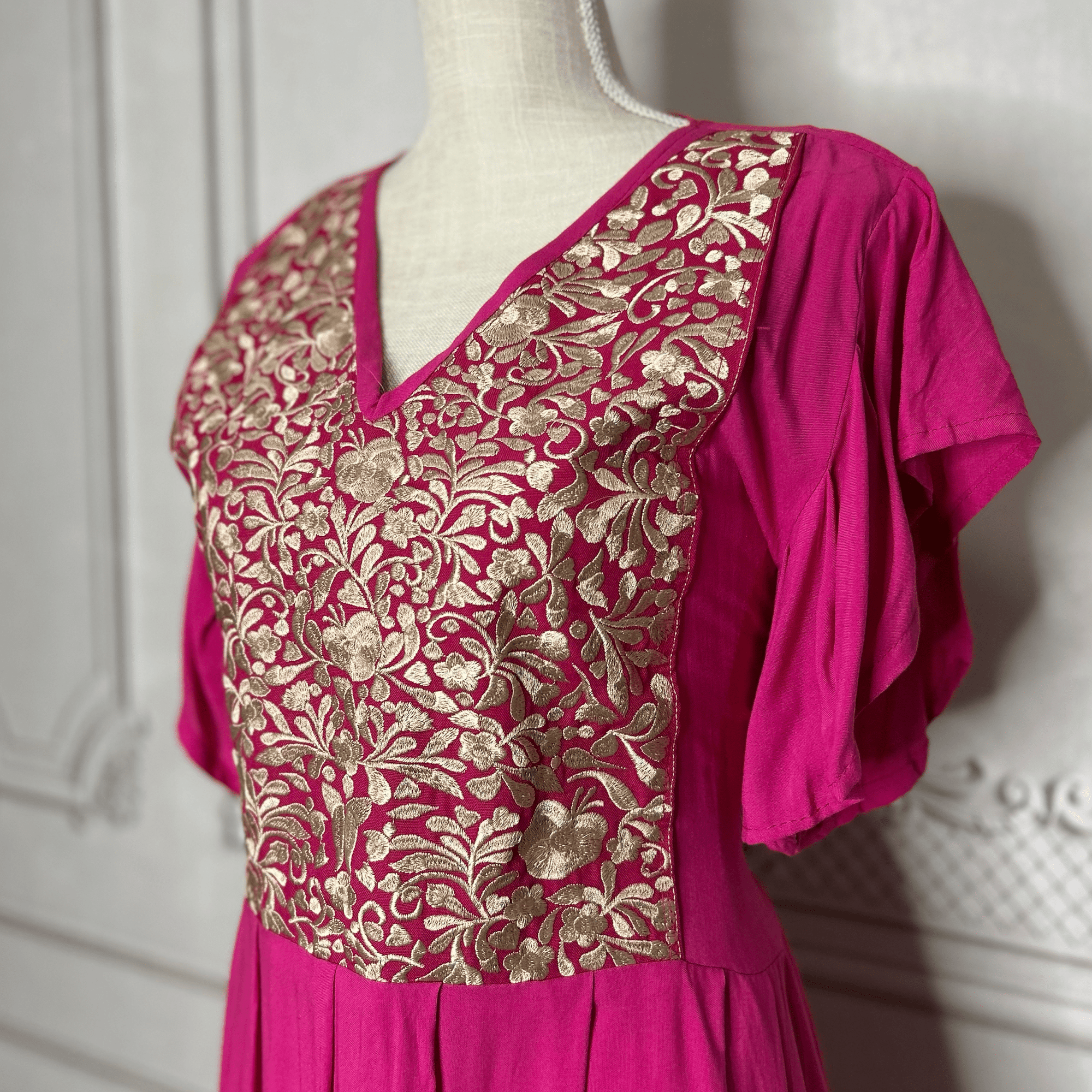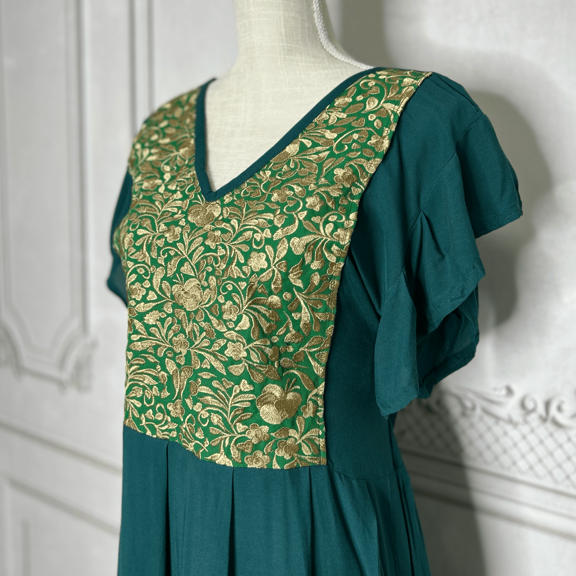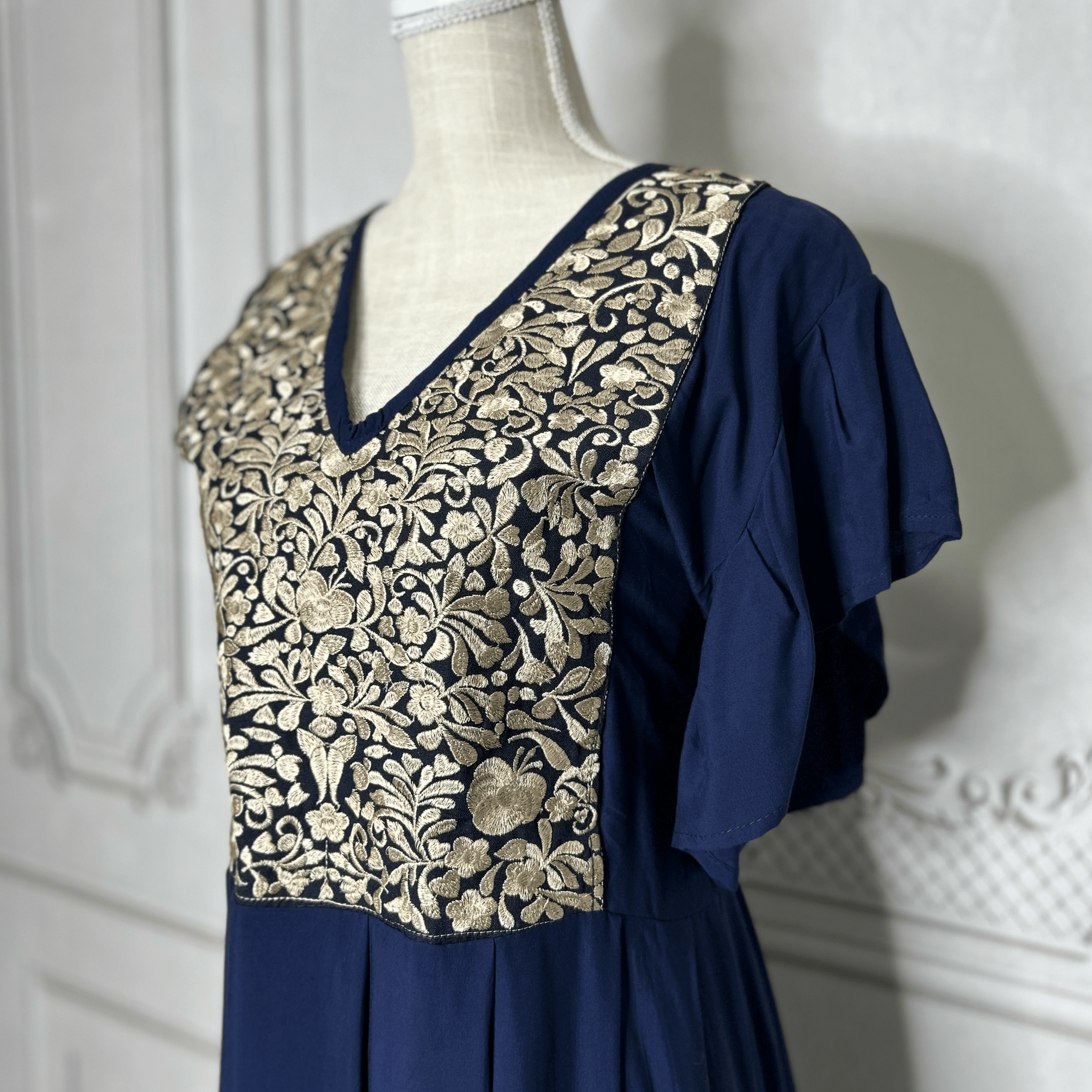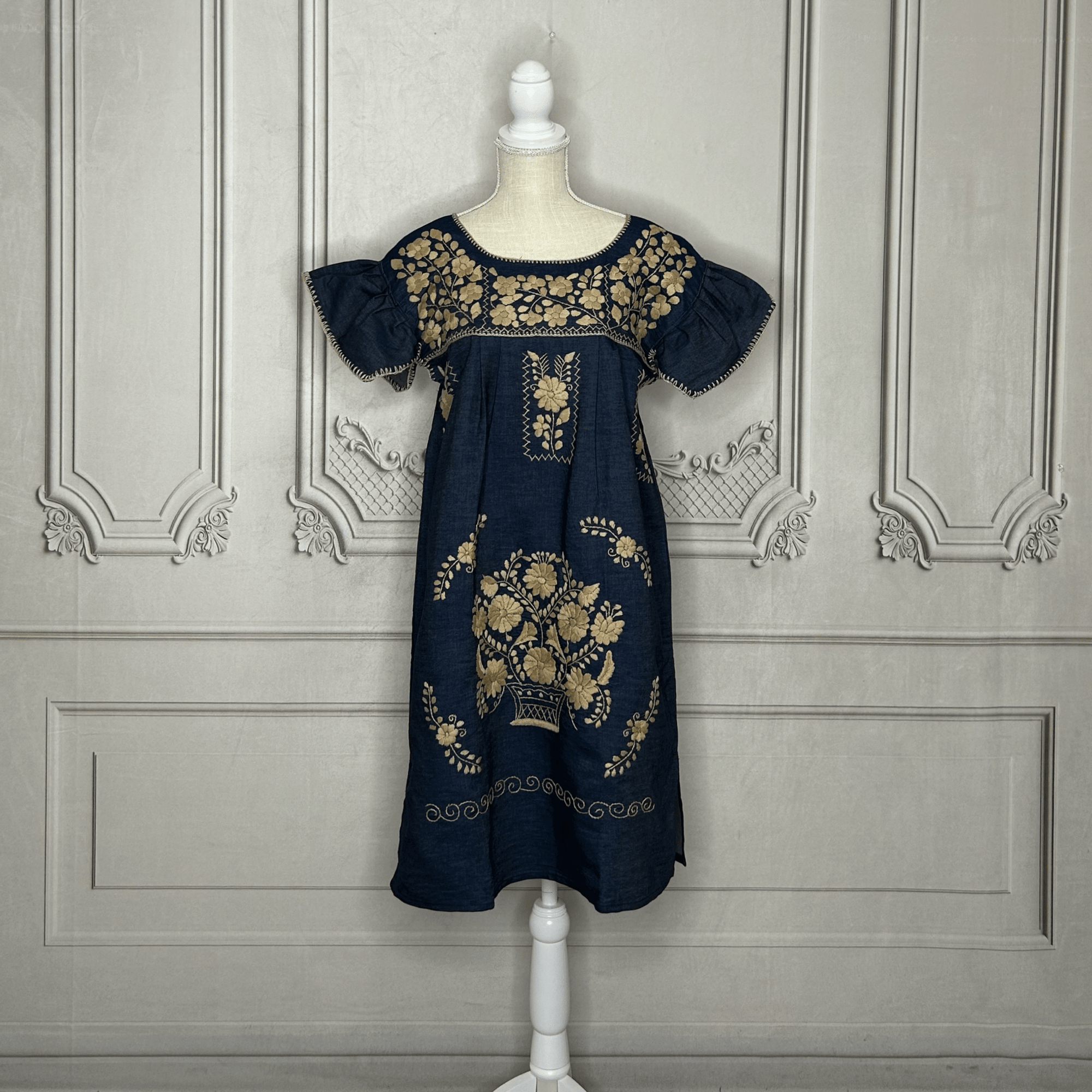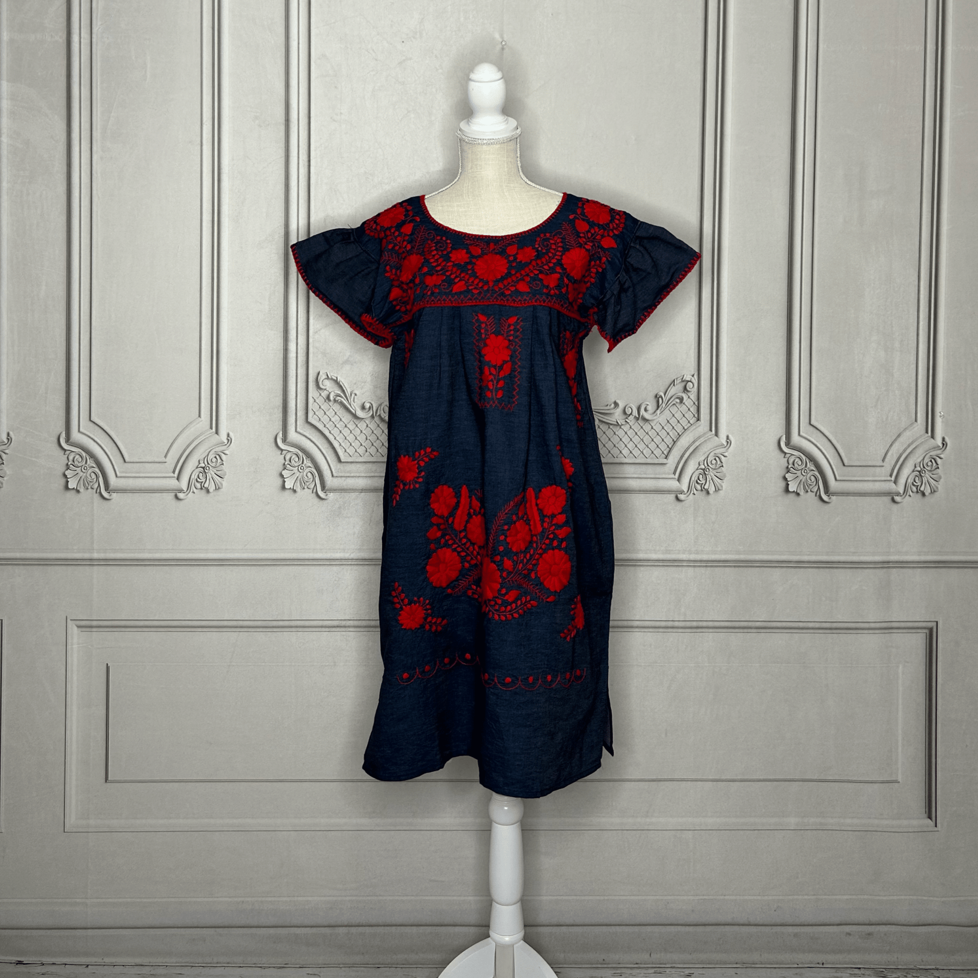 Puebla Denim Embroidered Mexican Dress - Butterfly Sleeve