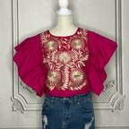 Elegant and stylish, the Butterfly Sleeve Mexican Blouse - Rococo is an eye-catching piece in one size. It features a beautifully embroidered rococo floral pattern on the front and has ties at the back. Crafted from 100% cotton and intricately embroidered with fine silk thread.