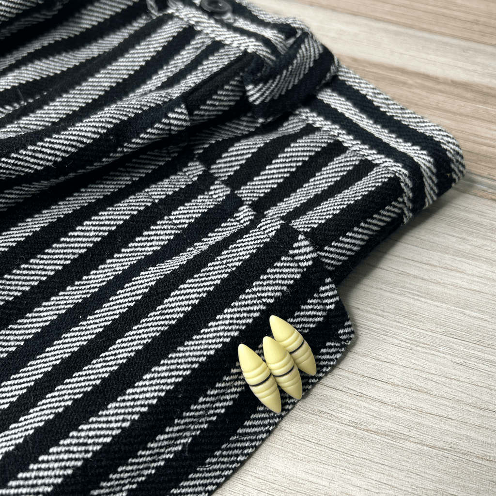 Pantalon caporal mexicain à fines rayures avec boutons en plastique sur les côtés. Fermeture à glissière et bouton. Deux poches frontales.