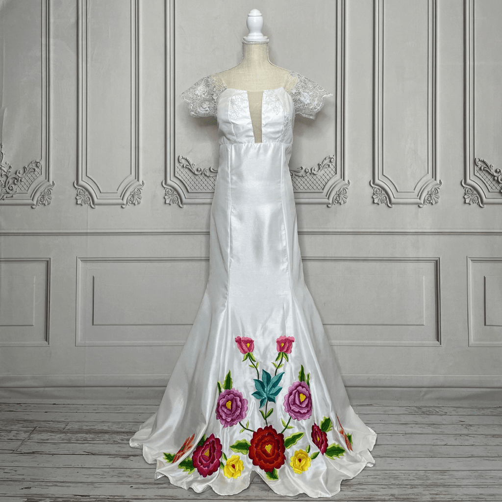 Magnifique robe de mariée en soie faite à la main et brodée en fil de soie fin. Elle est entièrement doublée de tulle sur une queue de sirène pour donner du volume. Manches en dentelle et détail au buste avec col en V transparent.