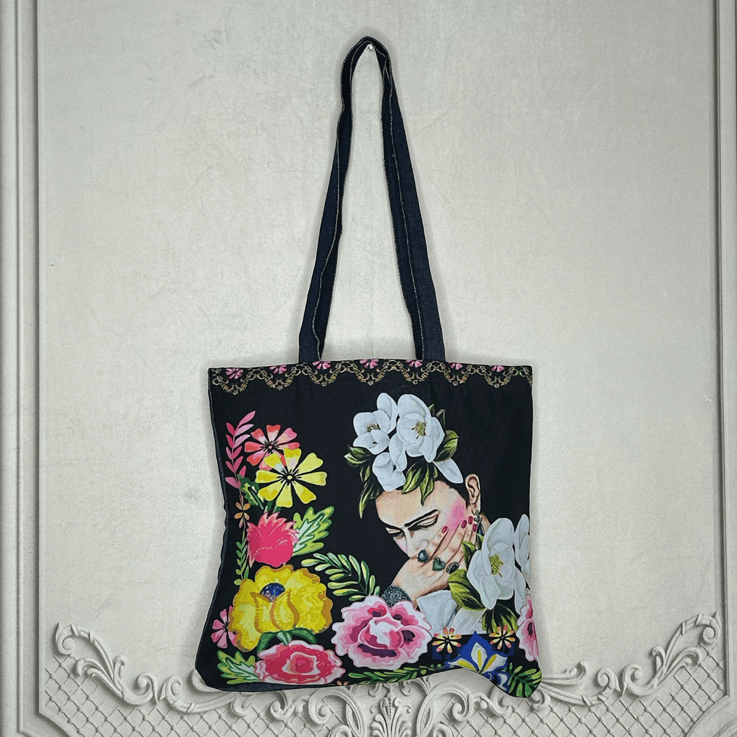 Lightweight Friday Kahlo Cartoon tote bag. There is a sublimated print on the front, denim back, and straps with a zippered opening—durable thick canvas fabric.