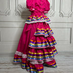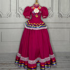 This beautiful Jalisco Outfit is made with high-quality satin ribbon and lace trim with a victorian tail. The top has a corset-style closure, which can be zippered at your request, and a fully circular skirt with two ties that allow adjusting at the waist for a better fit. It is available in women's and girls sizes.