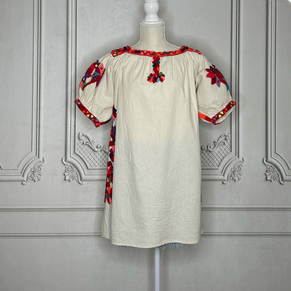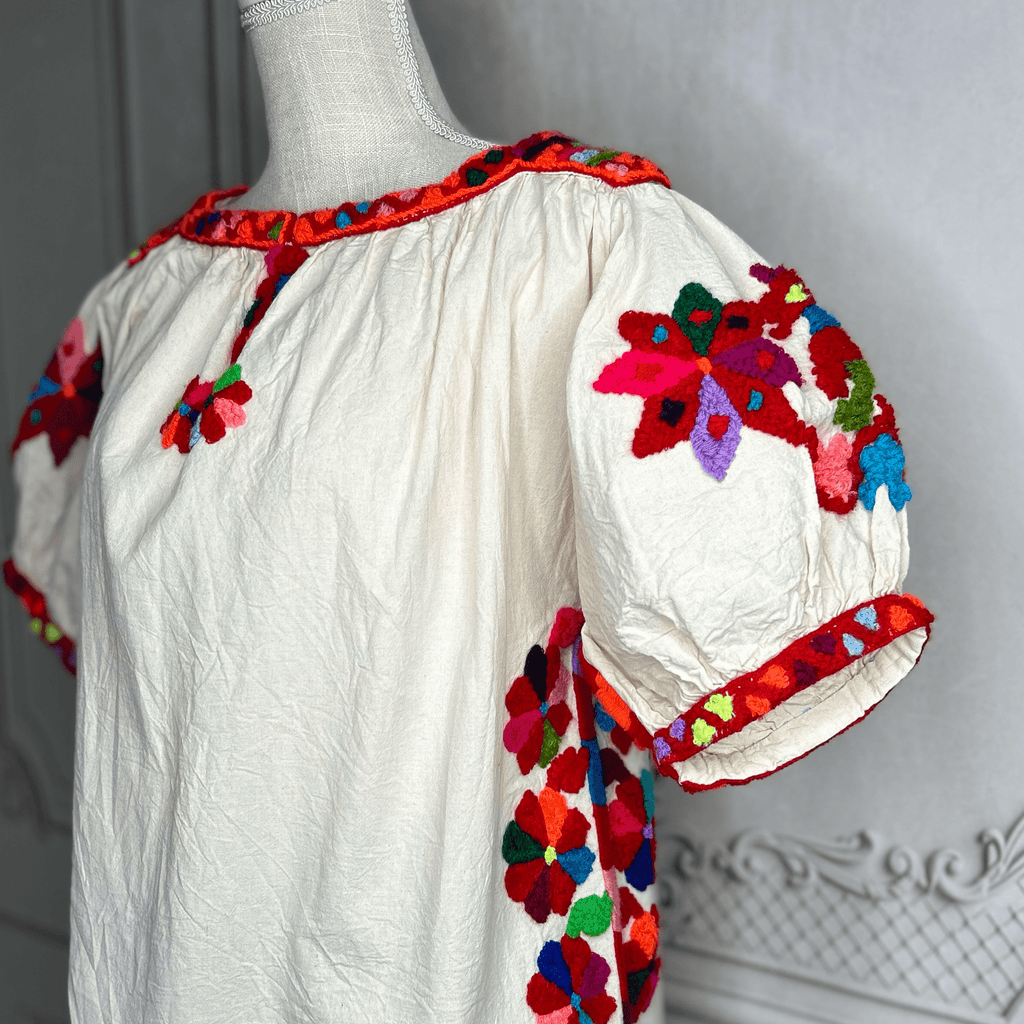 Cette magnifique tunique mexicaine unique en son genre représente la broderie maya perdue de la communauté Nahuatl de la municipalité isolée de Zontecomatlan Veracruz.