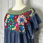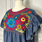 This chic denim maxi dress features ruffled sleeves and is intricately hand embroidered with cotton thread in our beloved rosie pattern. Syle B has a shorter length of 49".