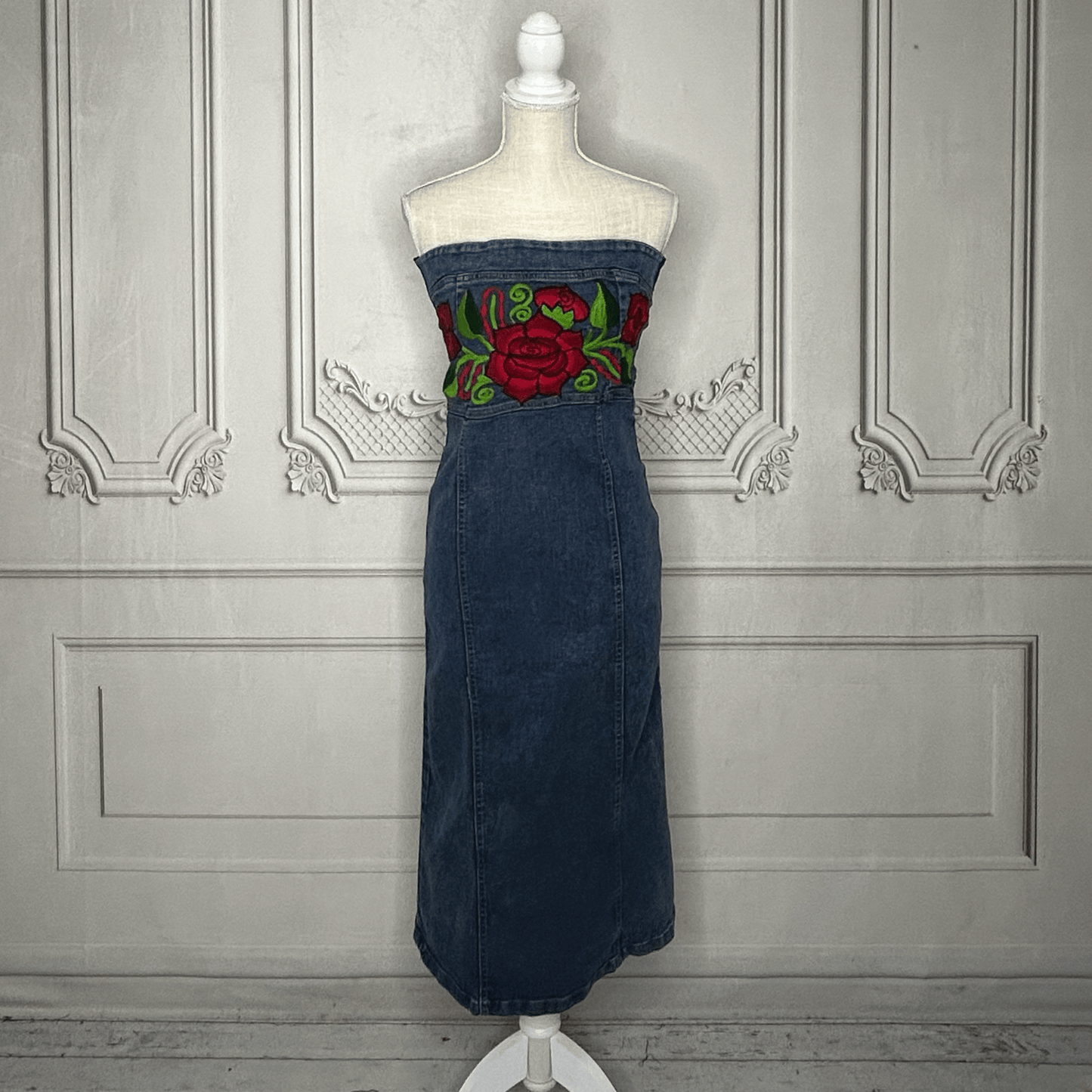 This strapless dress features a soft stretch denim fabric and beautiful Mexican embroidered flowers on the bust area. Its midi length and pencil skirt cut make it perfect for showcasing your Mexican heritage at any event, while the zippered back and 10 inch slit add practicality and style.