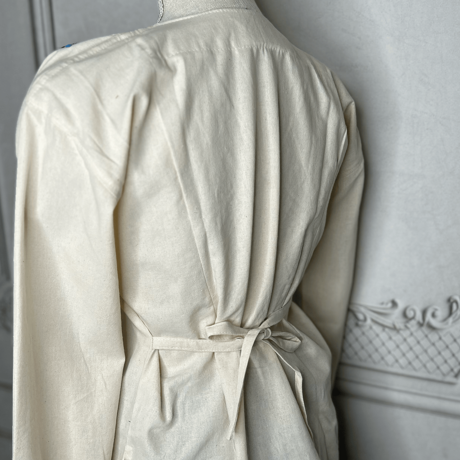 This classic tunic from Mexico showcases detailed embroidery on the neckline and sleeves, made from natural, hand-dyed cotton manta fabric. The sophisticated V-neck is embellished with lace and a tie for added intricacy, and the wrists feature embroidery and a tassel detail. Tie-backs offer an adjustable fit.