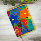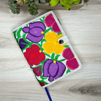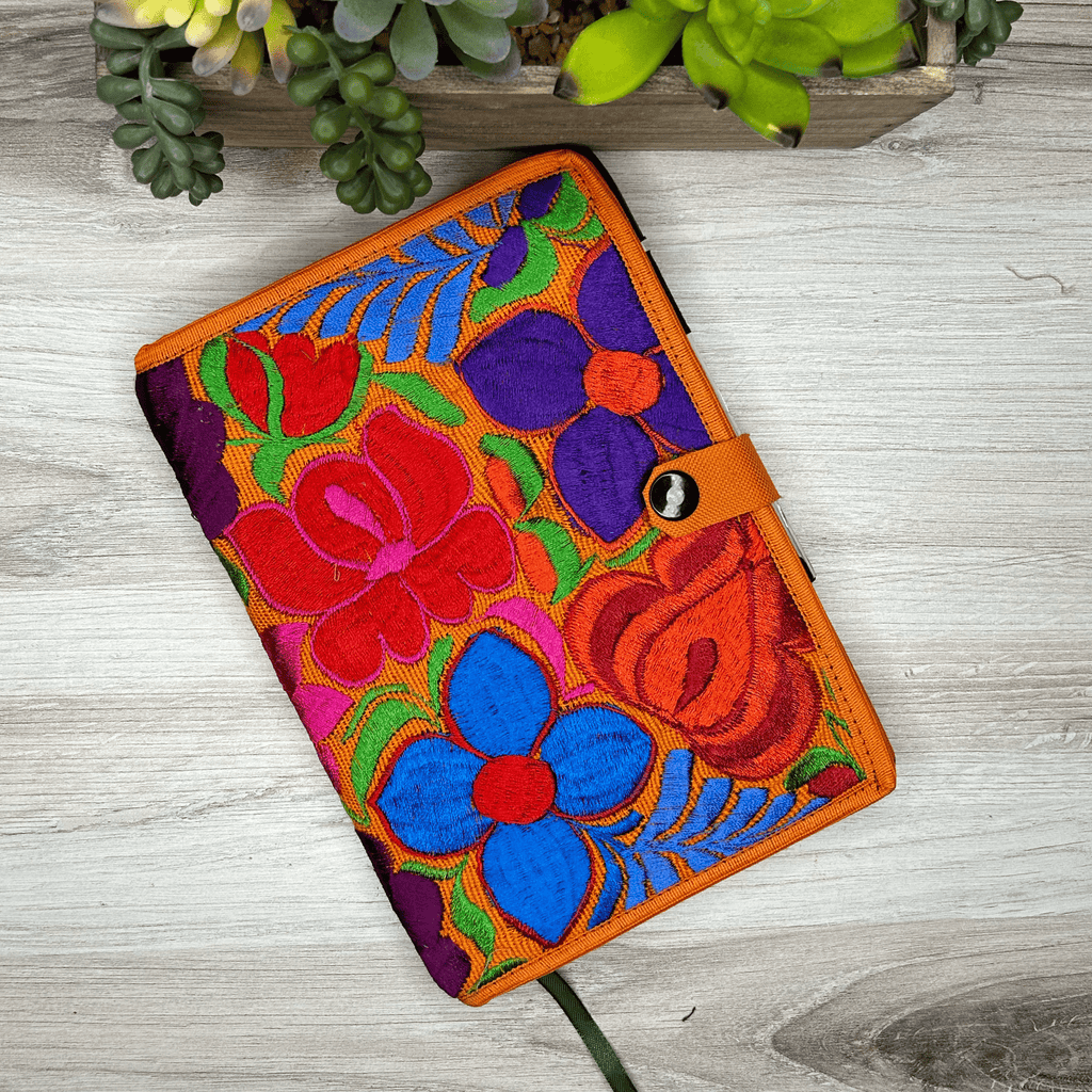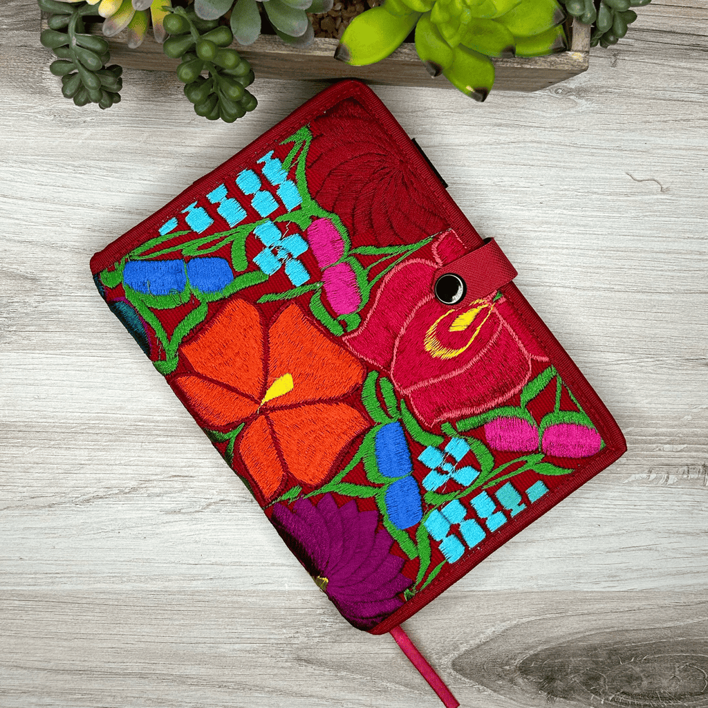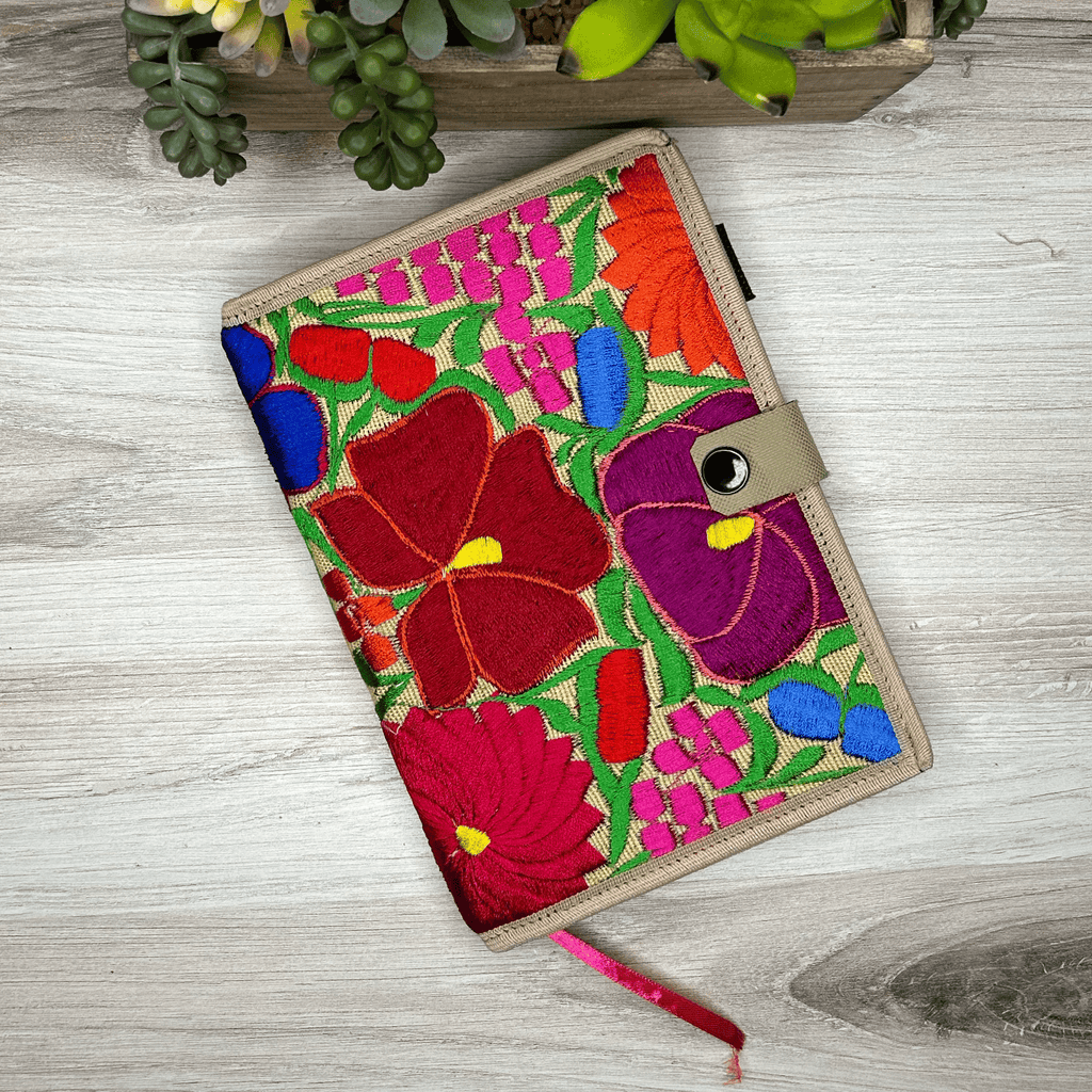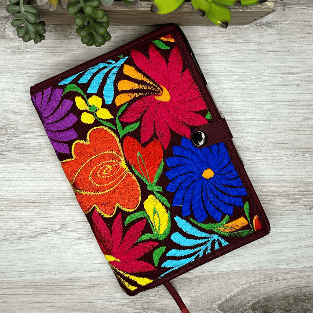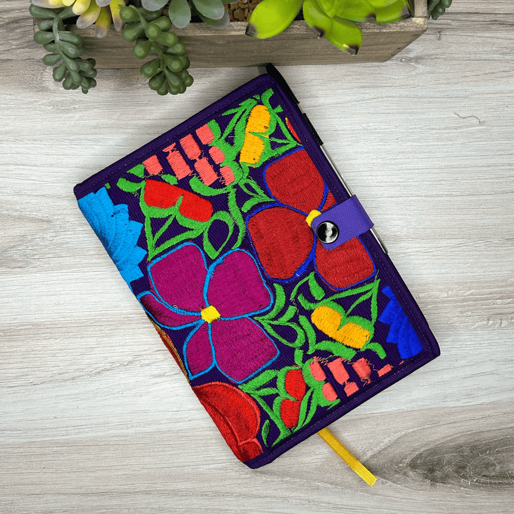 La couverture du carnet est fabriquée à la main avec des détails brodés uniques par des artisans mexicains. Il comprend un carnet de 80 pages de 5,5" x 7,75", un stylo avec une fente pour stylo et un marque-page en ruban.