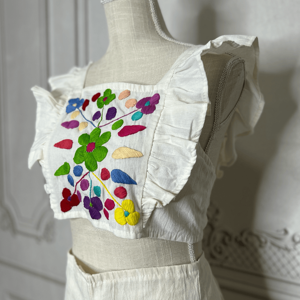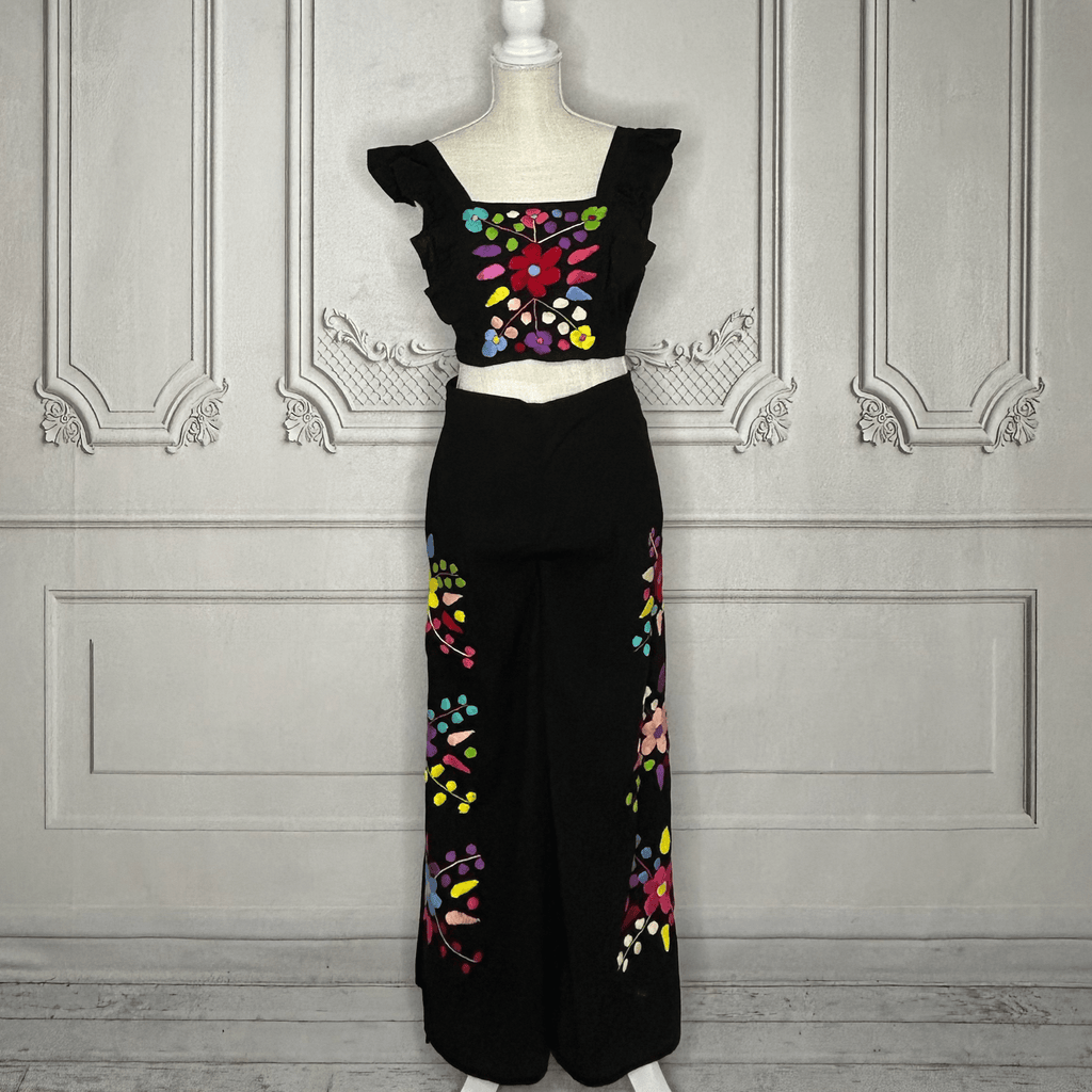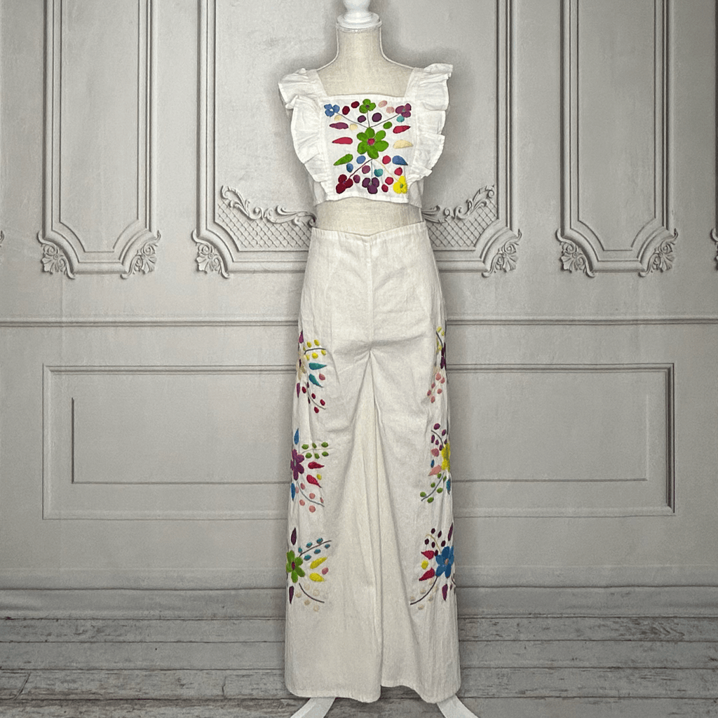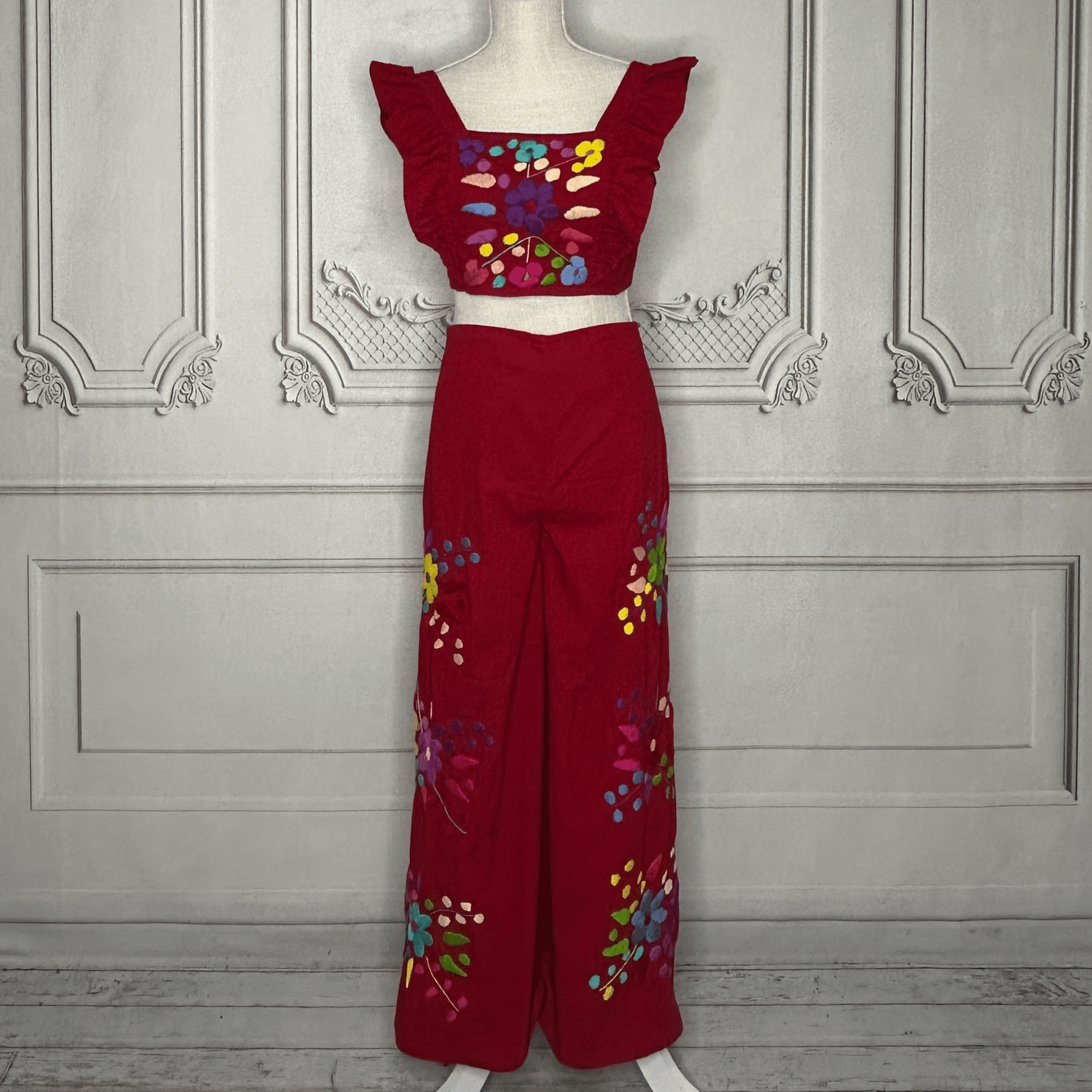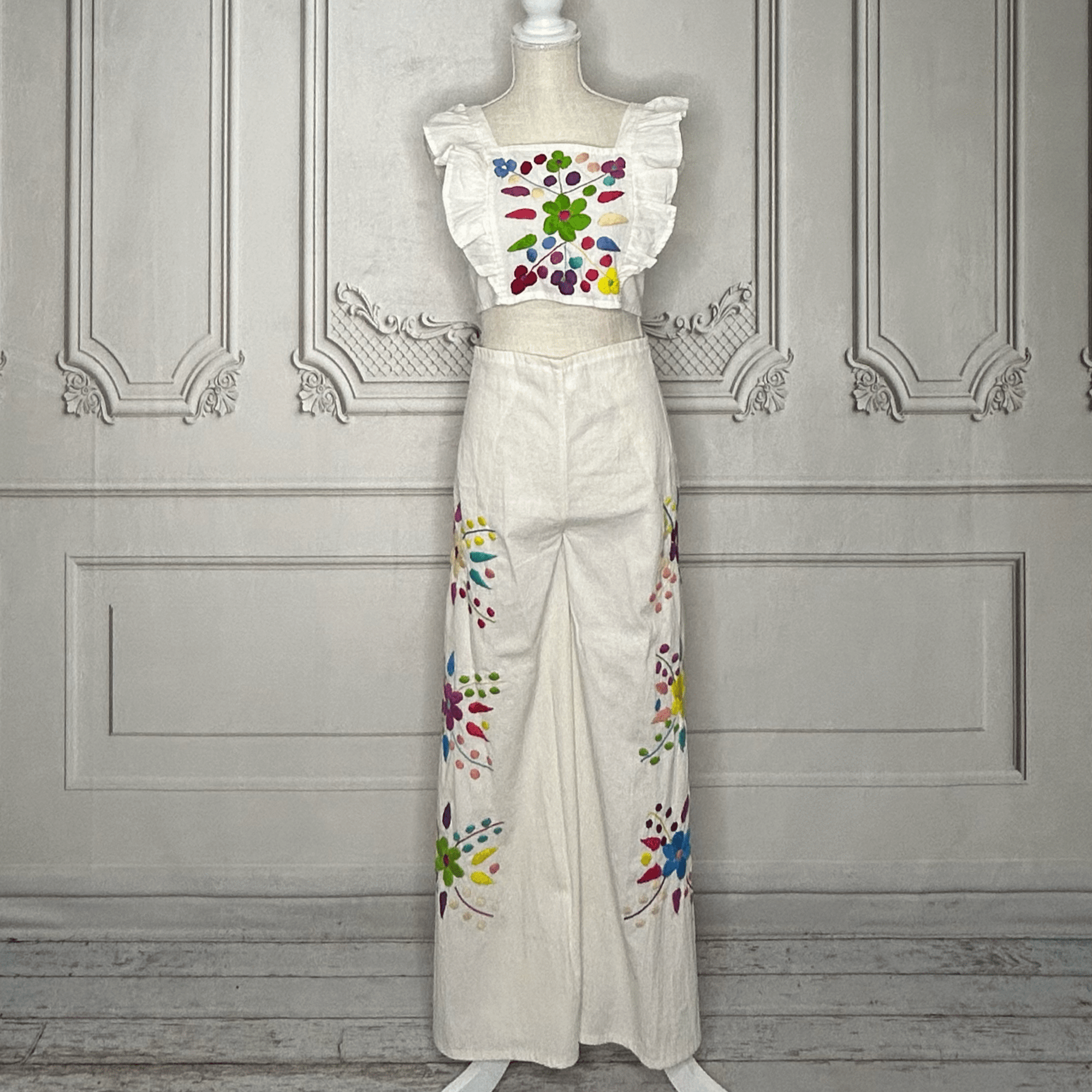 Experience the perfect summer or Caribbean vacation with our Mexican Embroidered Pant Set - Rosie. This set, made of 100% cotton manta fabric, includes a wrap around pant and crop top, both featuring hand-embroidered details in cotton thread. The crop top has an open back and waist ties for adjustable fit, and it is designed to fit sizes X-Small to Small.