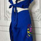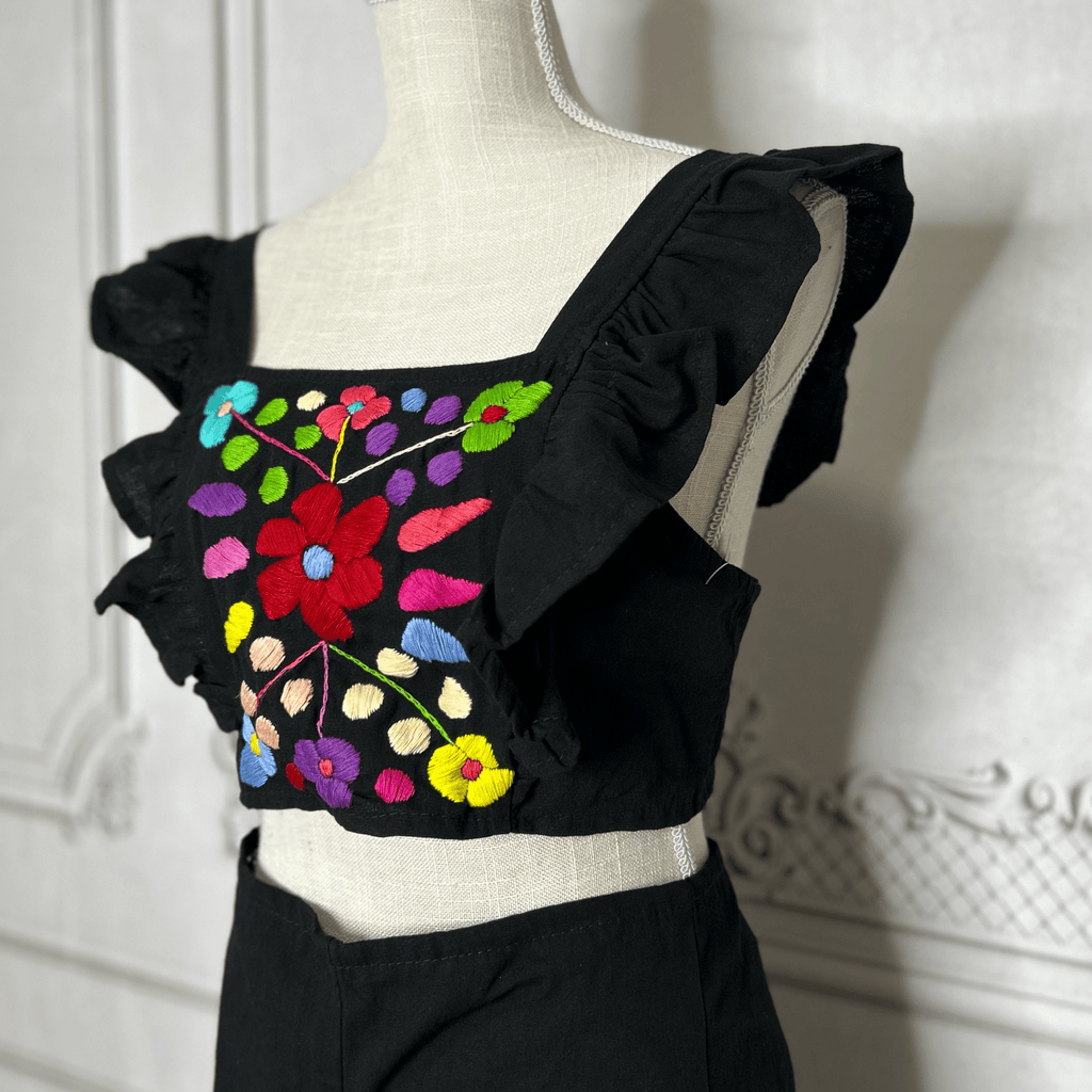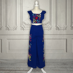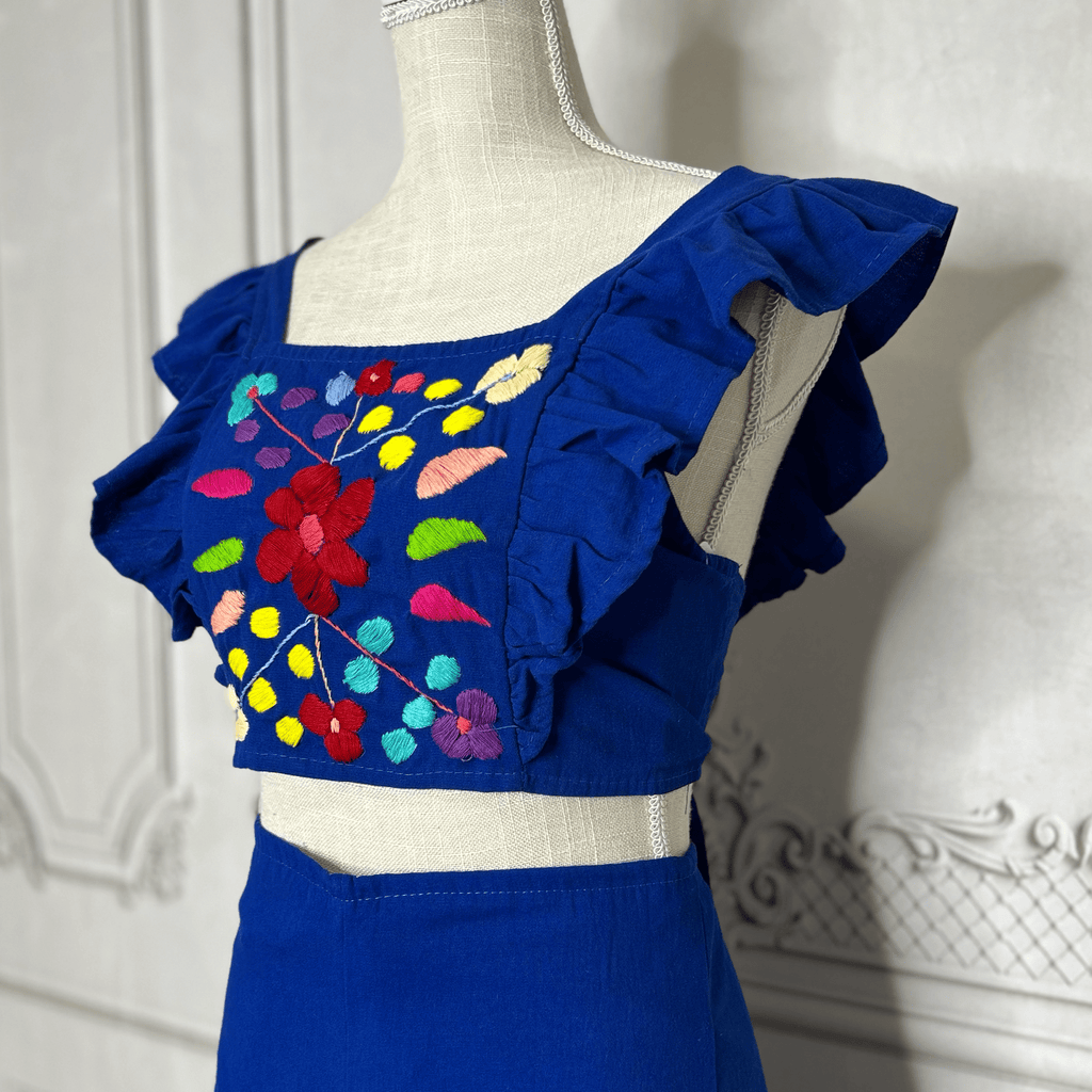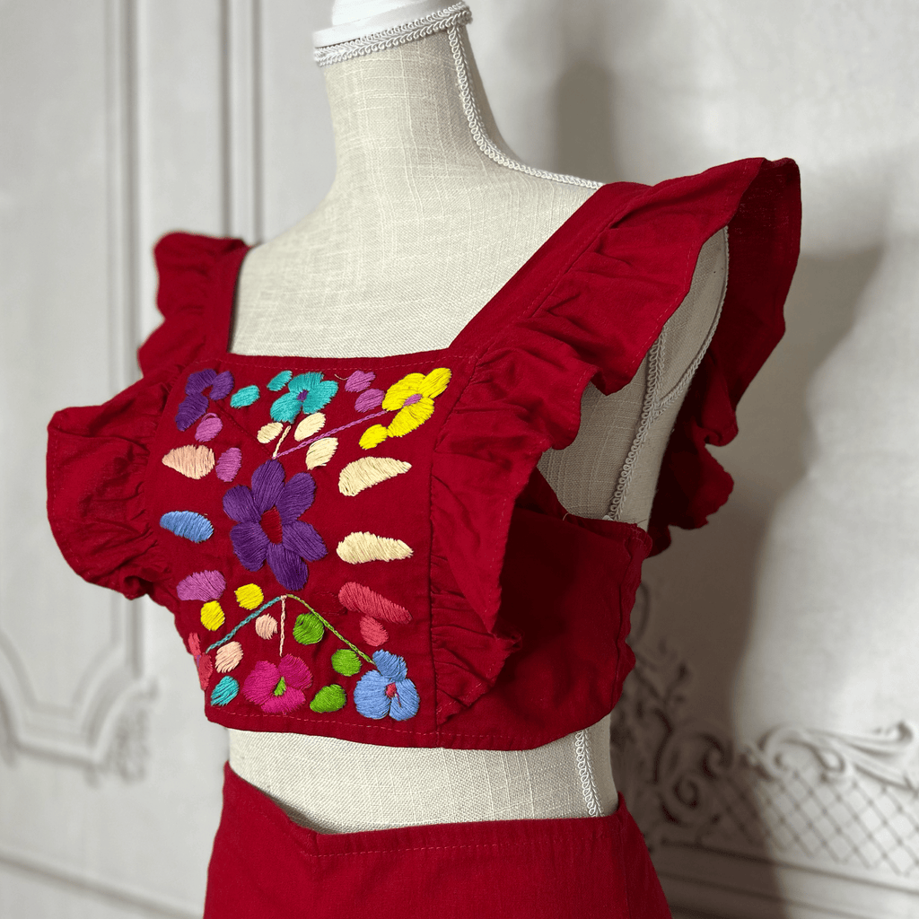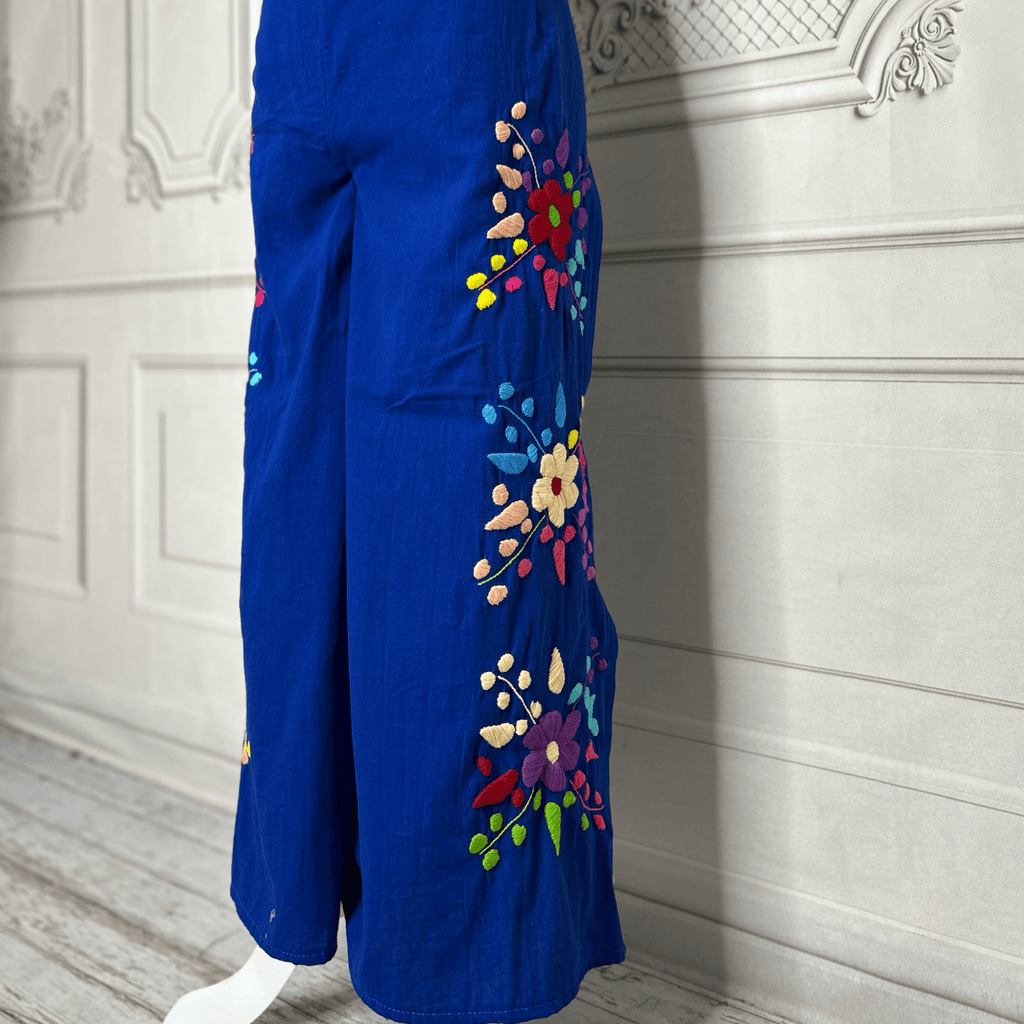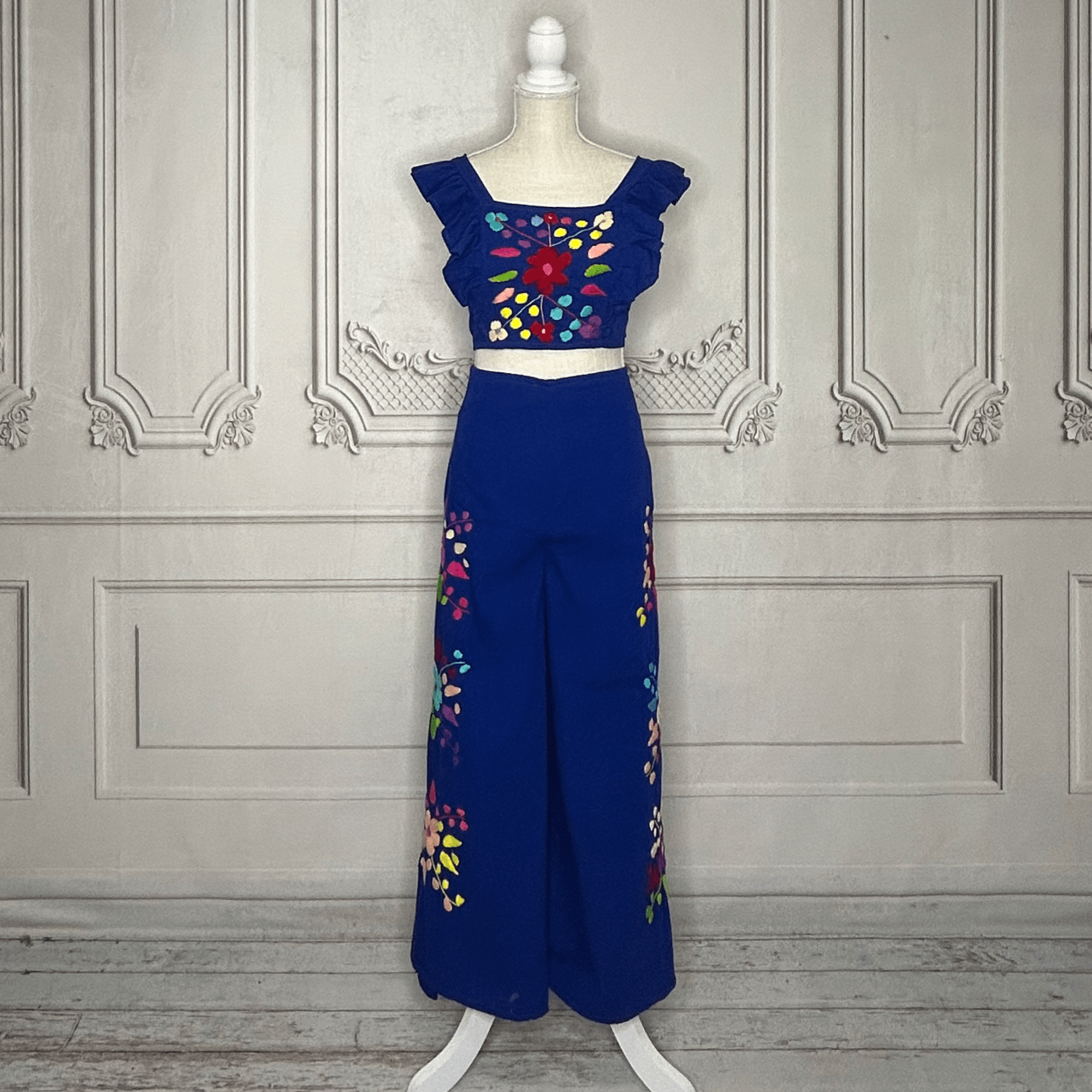 Experience the perfect summer or Caribbean vacation with our Mexican Embroidered Pant Set - Rosie. This set, made of 100% cotton manta fabric, includes a wrap around pant and crop top, both featuring hand-embroidered details in cotton thread. The crop top has an open back and waist ties for adjustable fit, and it is designed to fit sizes X-Small to Small.