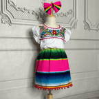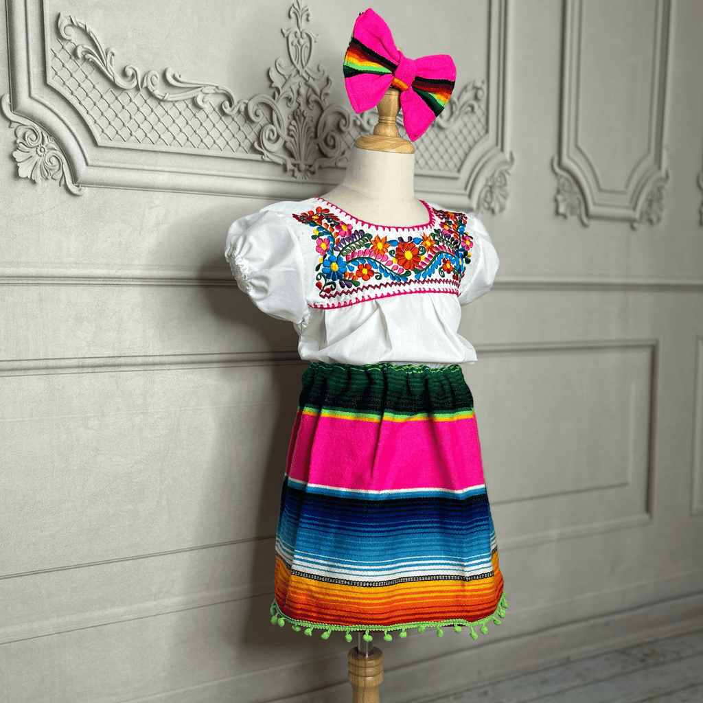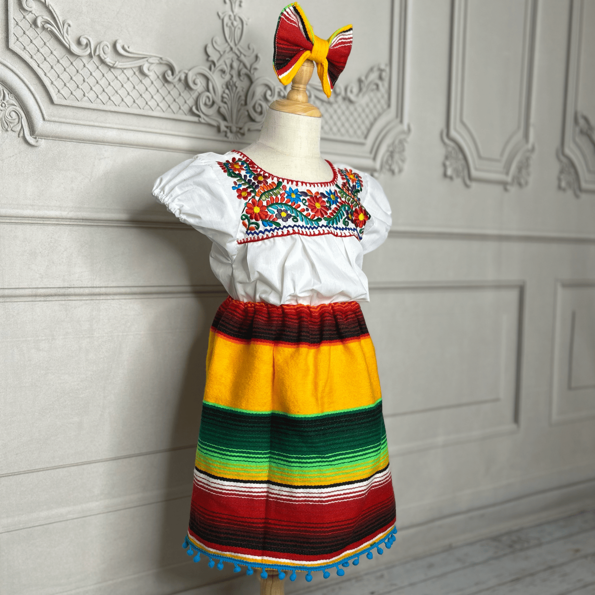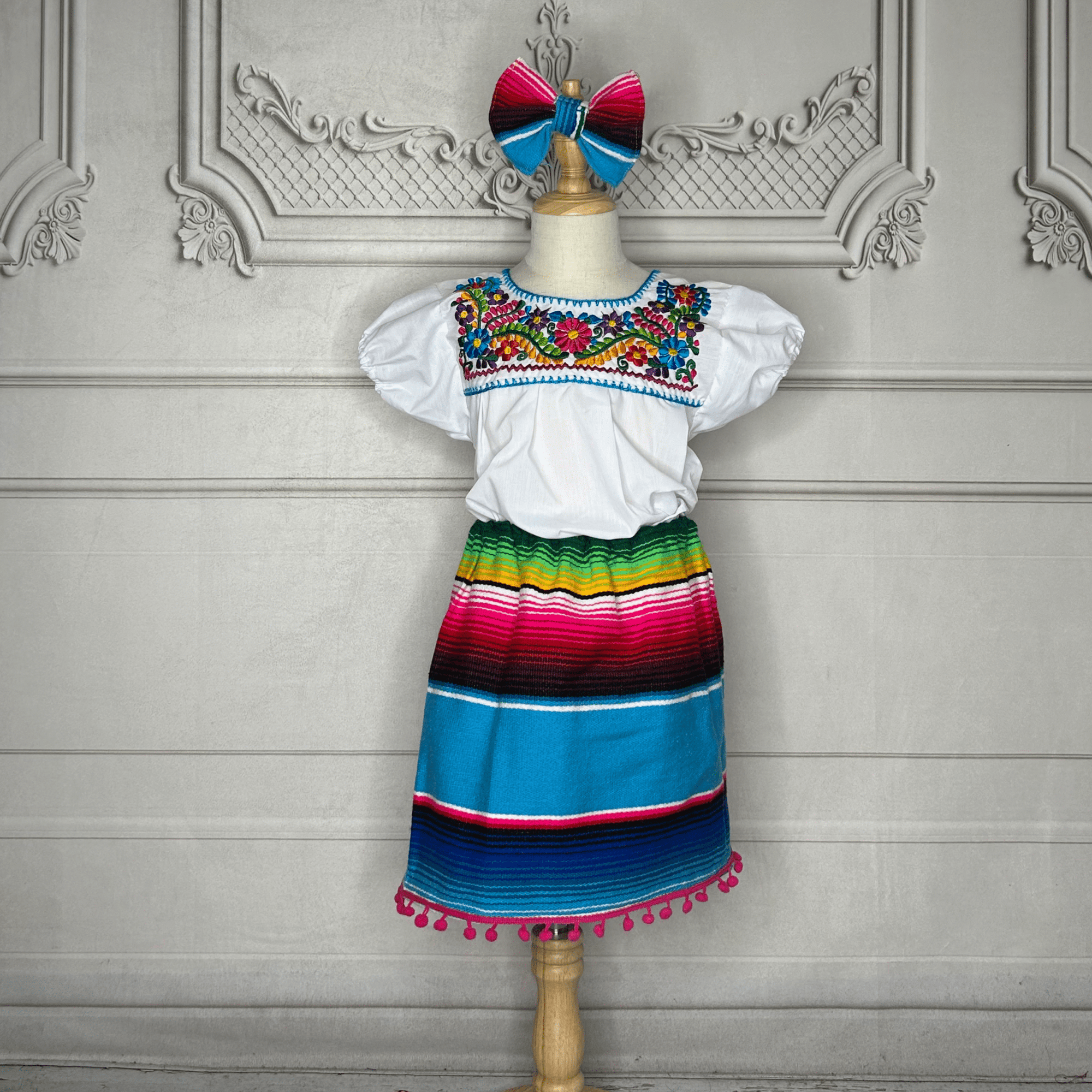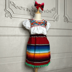Includes: Elastic waist sarape skirt; Embroidered Puebla Blouse; Hair bow with clip.