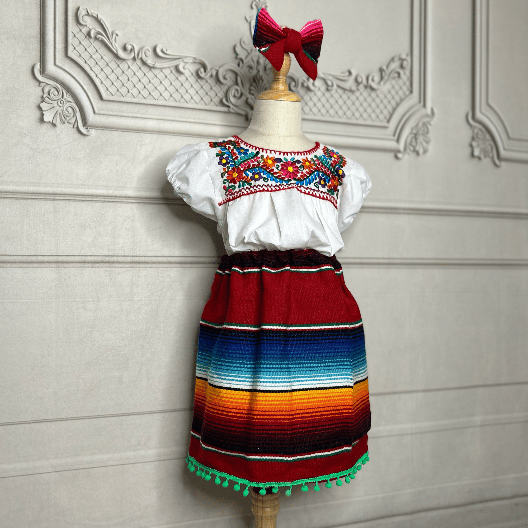 These Mexican Skirt Sets are made from a genuine sarape throw blanket and decorated with hand embroidery. The skirt is accented with a vibrant pom-pom trim and a matching bow. Available in various colors, each one showcases a distinct design that may vary slightly from the images provided. Please remember that the selected color represents the primary hue of the sarape print. Images are provided for reference only and may not precisely match the handmade and one-of-a-kind item you receive.
