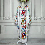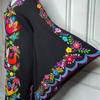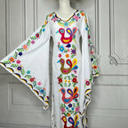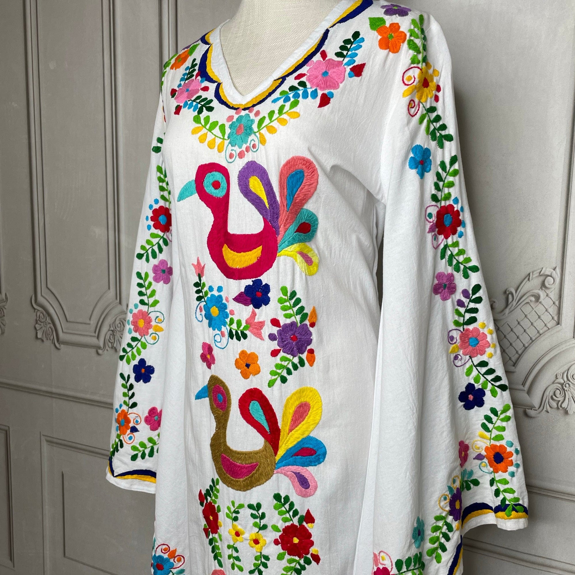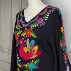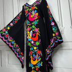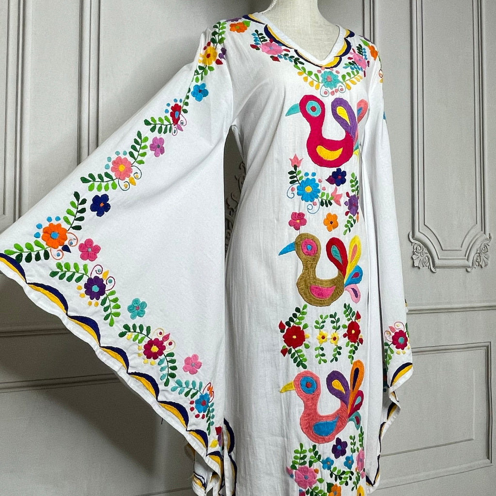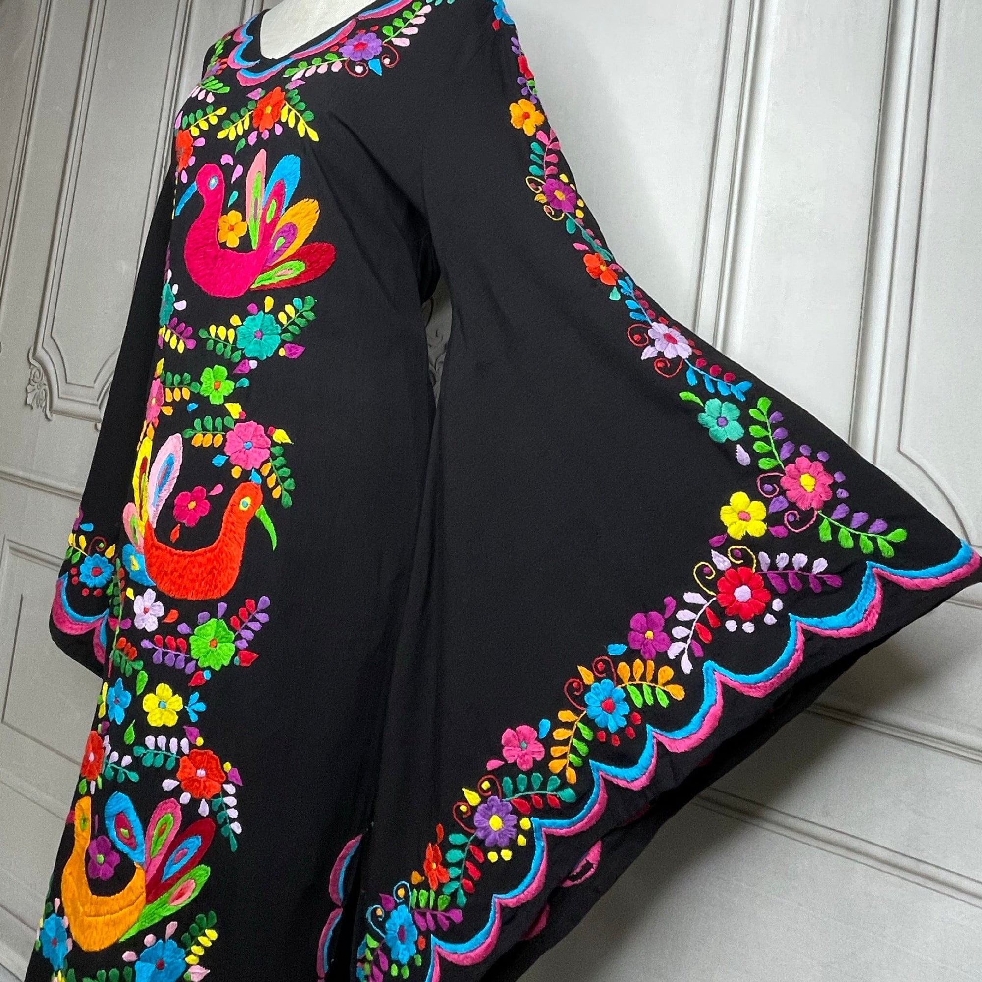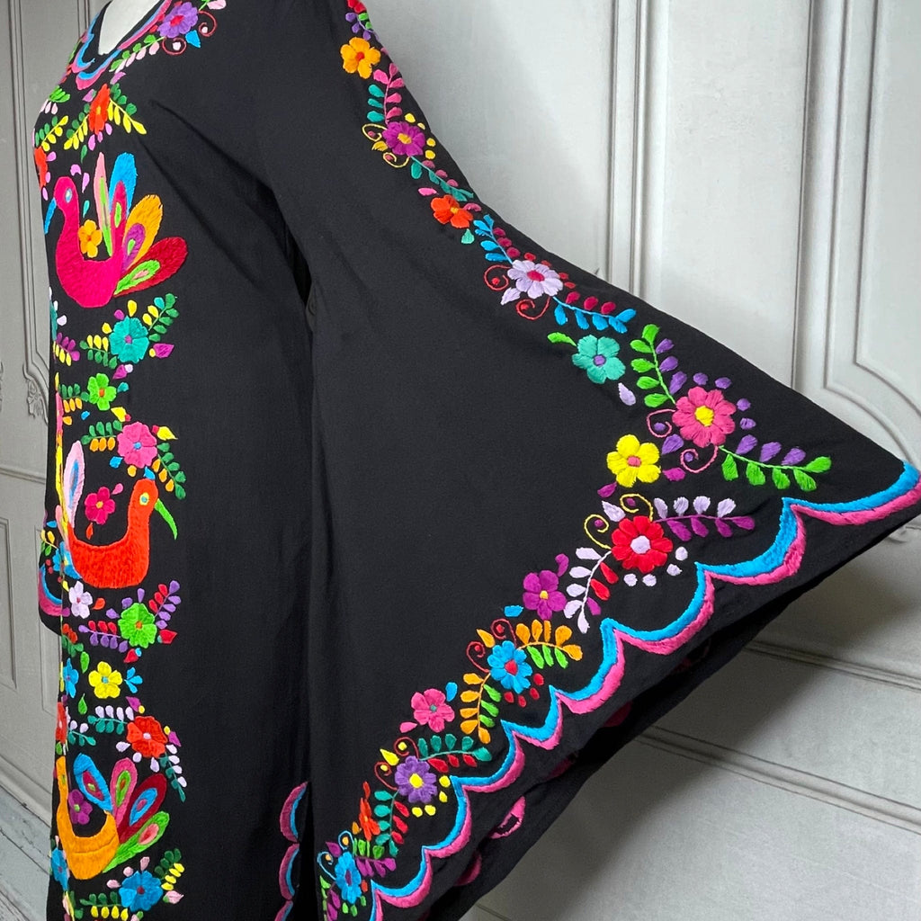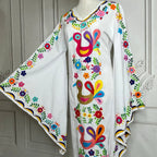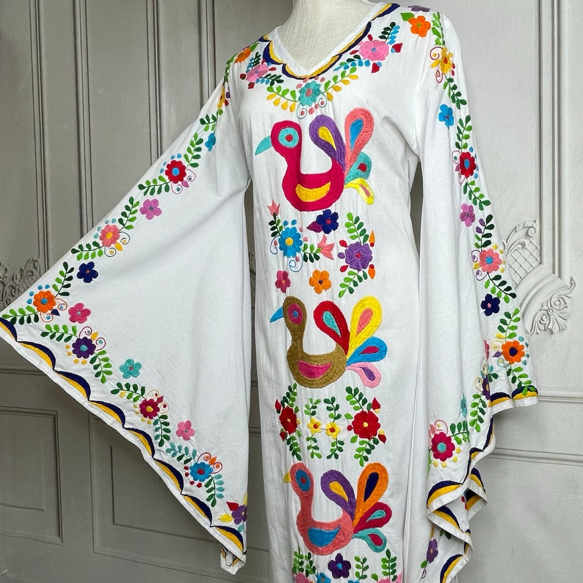 Magnifique robe mexicaine à manches cloche. Broderie frontale en fil de coton fin et manches cloche détaillées. Parfait pour un mariage sur le thème mexicain. Dos zippé et fente d'environ 21" des deux côtés.