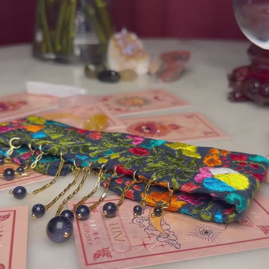 Handmade in Mexico, this one-of-a-kind choker features traditional San Antonino embroidery paired with real Blue Aventurine crystals. Completely unique, only one.