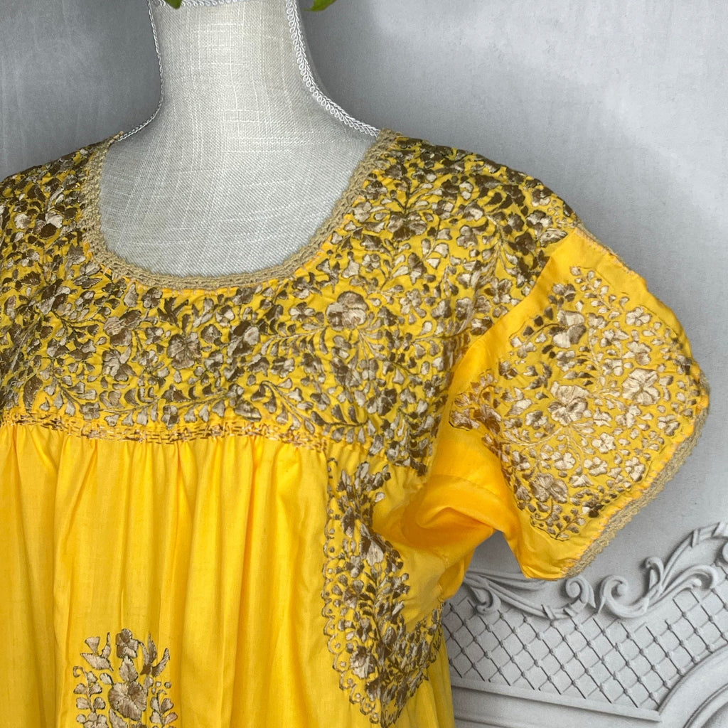 Magnifique robe San Antonio brodée main des deux côtés au fil de soie sur tissu popeline. Les détails raffinés de la robe sont un incontournable de l'État d'Oaxaca, au Mexique. Les artisans mettent jusqu'à un an pour réaliser une robe. Disponible en plusieurs couleurs.