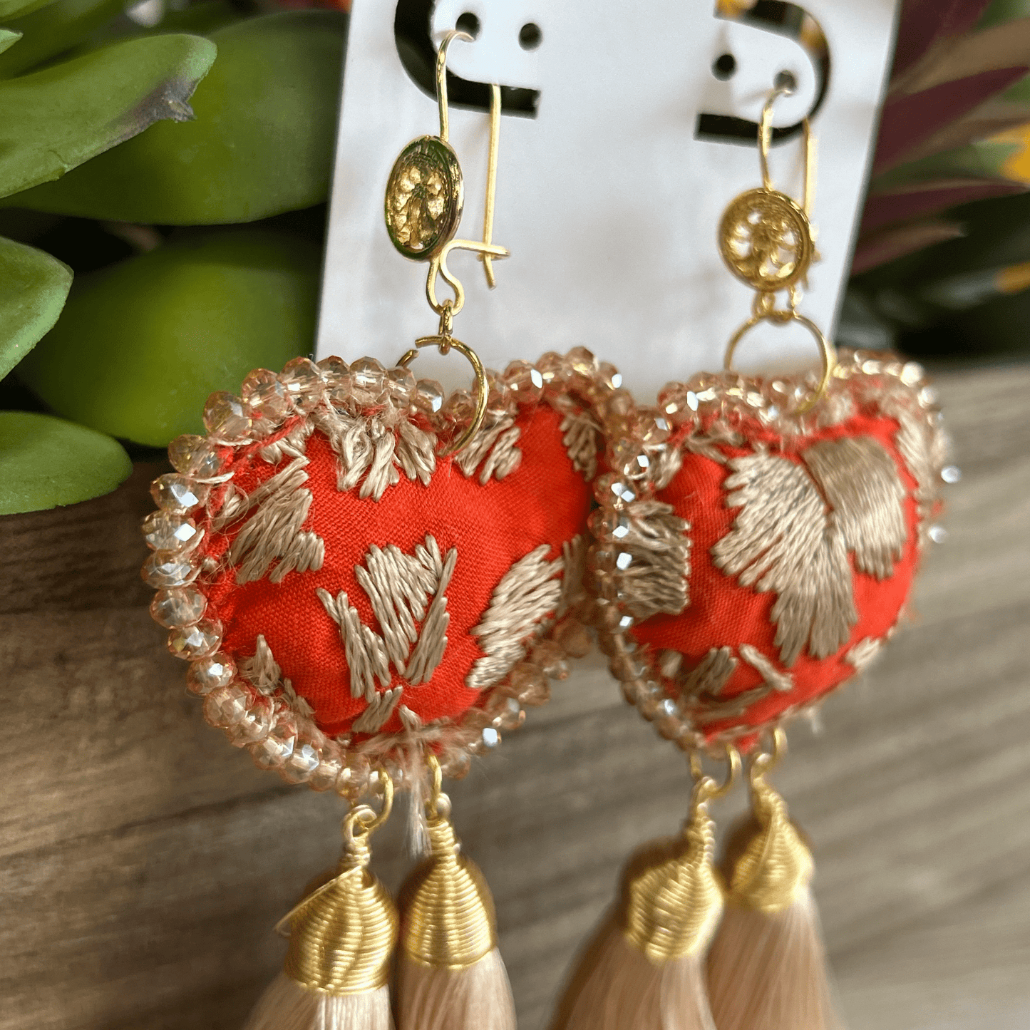 San Antonino Mexican Embroidered Heart Earrings - Orange Gold