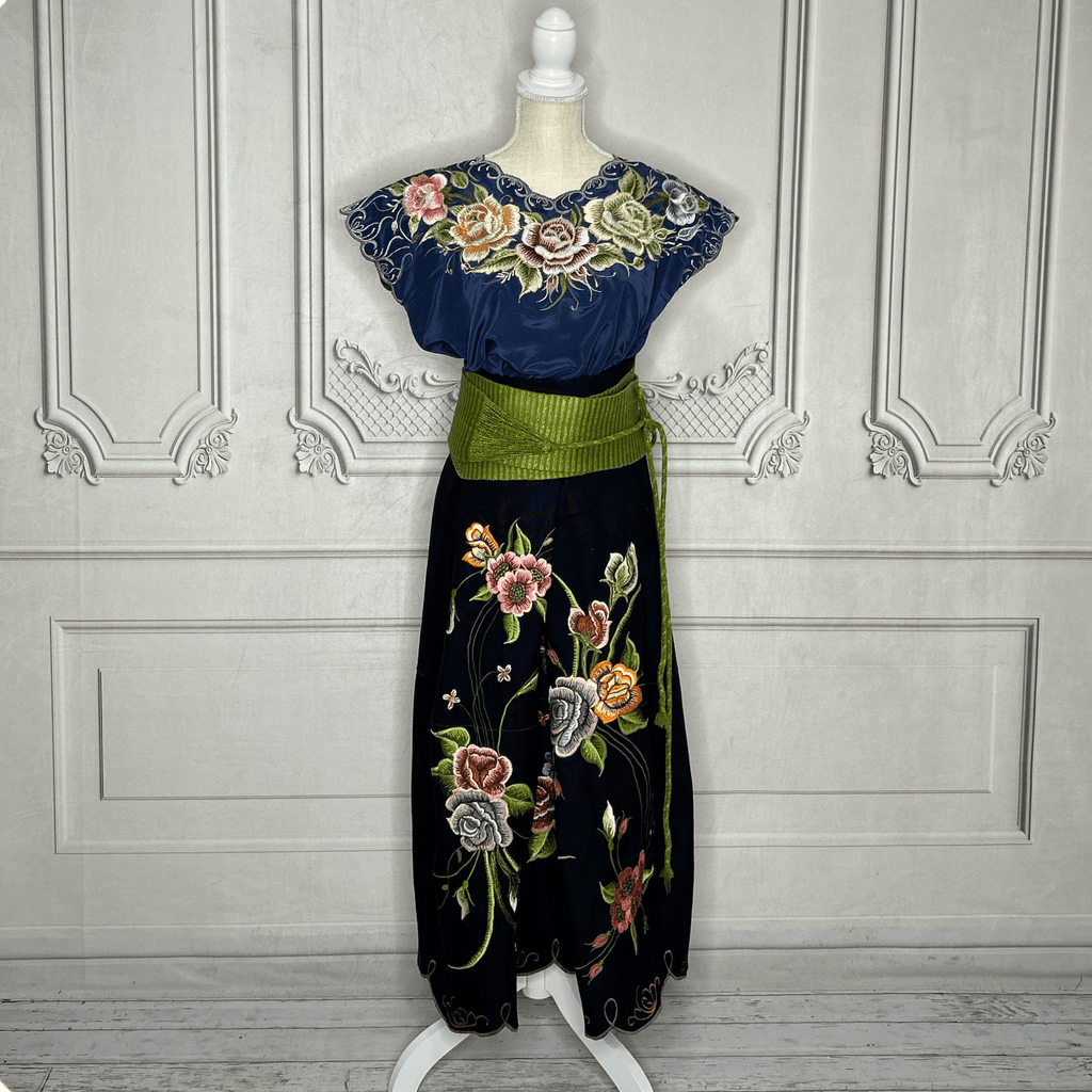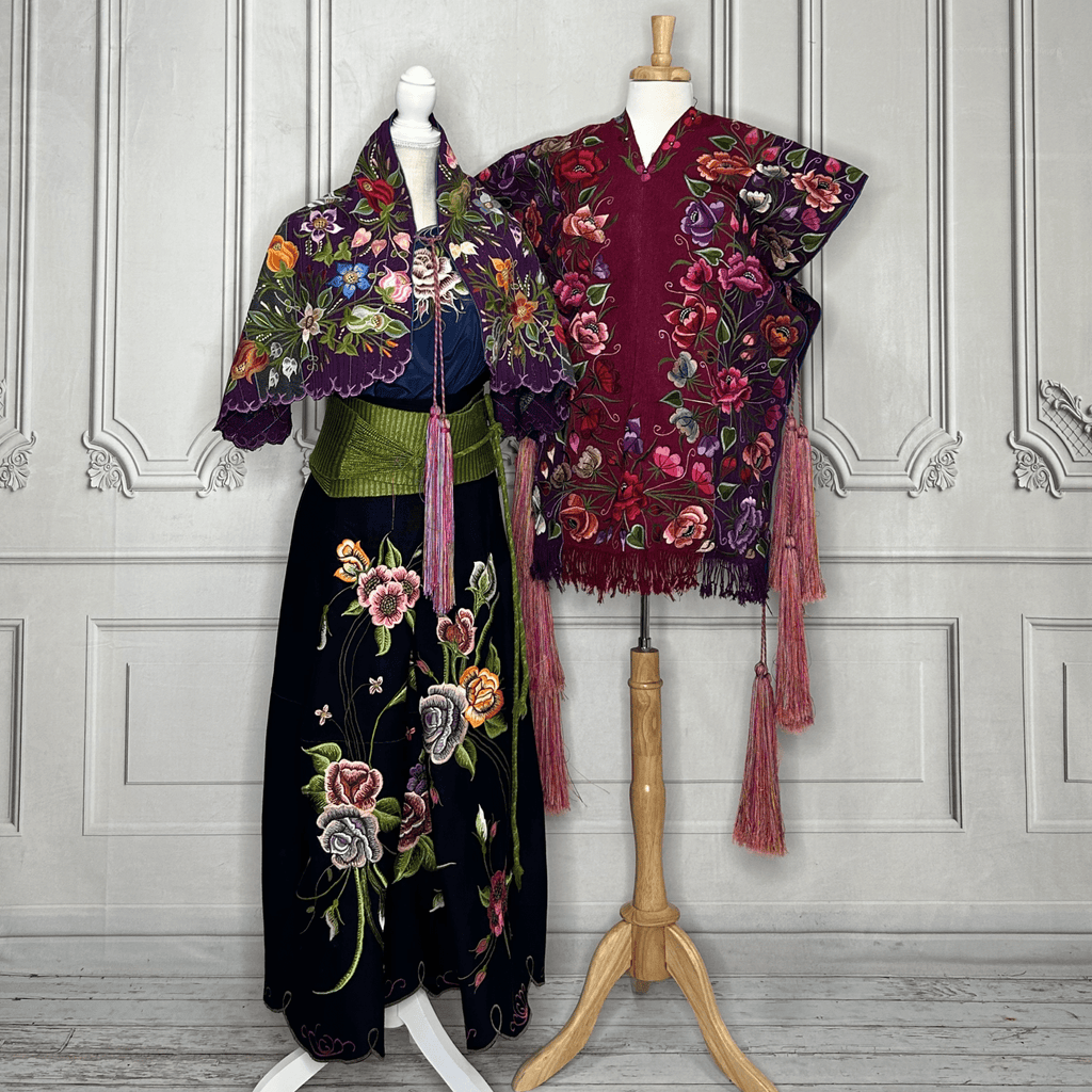 Tenue traditionnelle des Tzotziles , un groupe indigène qui habite Zinacantan, Chiapas . Le mot Zinacantan signifie « lieu des chauves-souris », symbolisé par la cape que les femmes portent sur leurs épaules appelée Machabal . Les couleurs sombres et riches de la tenue représentent leur environnement, tandis que les couleurs florales vives représentent leur culture économique.