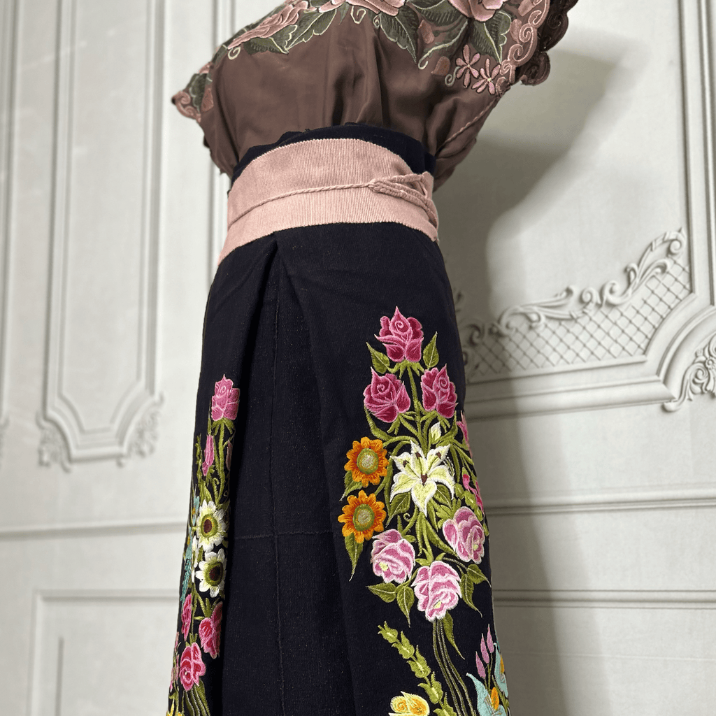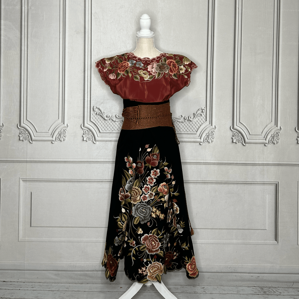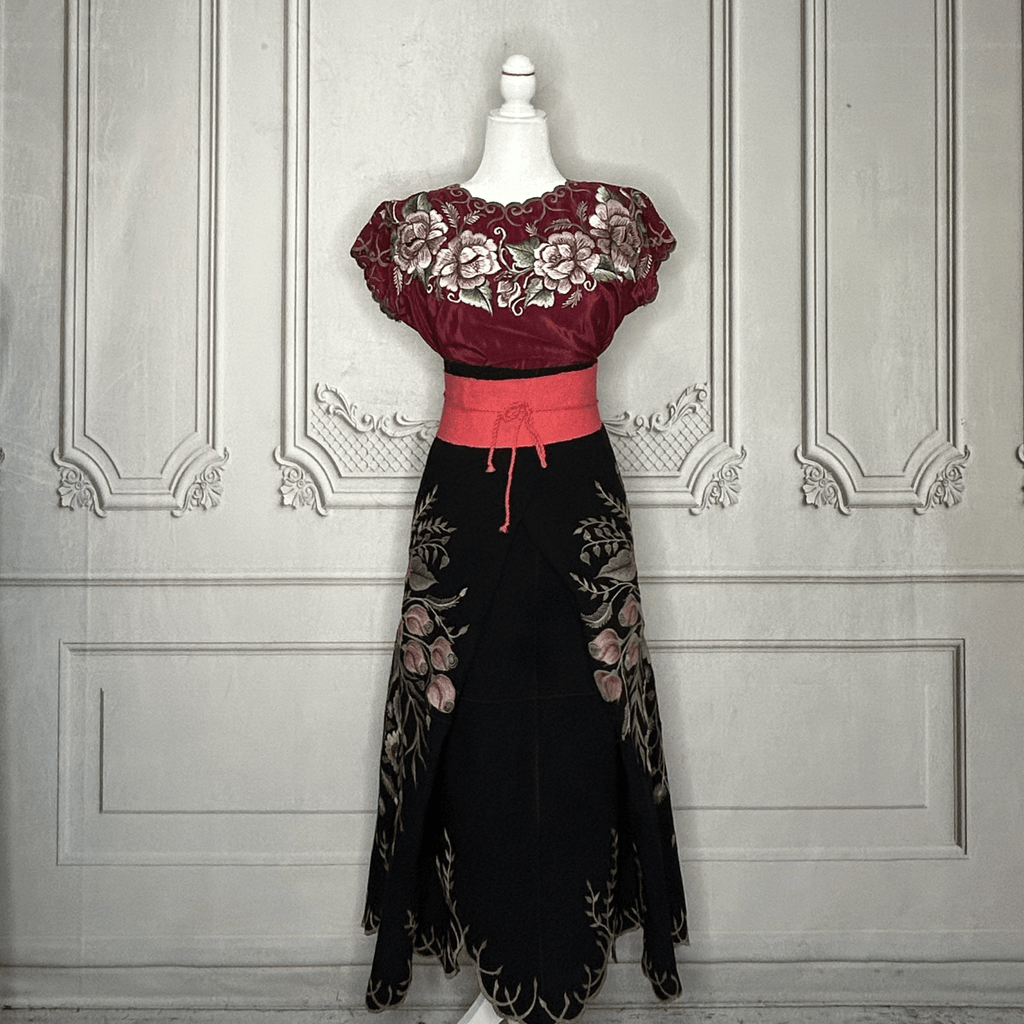 Description:-La jupe est un refajo qui s'enroule autour de la taille et est retenu par une ceinture