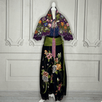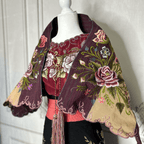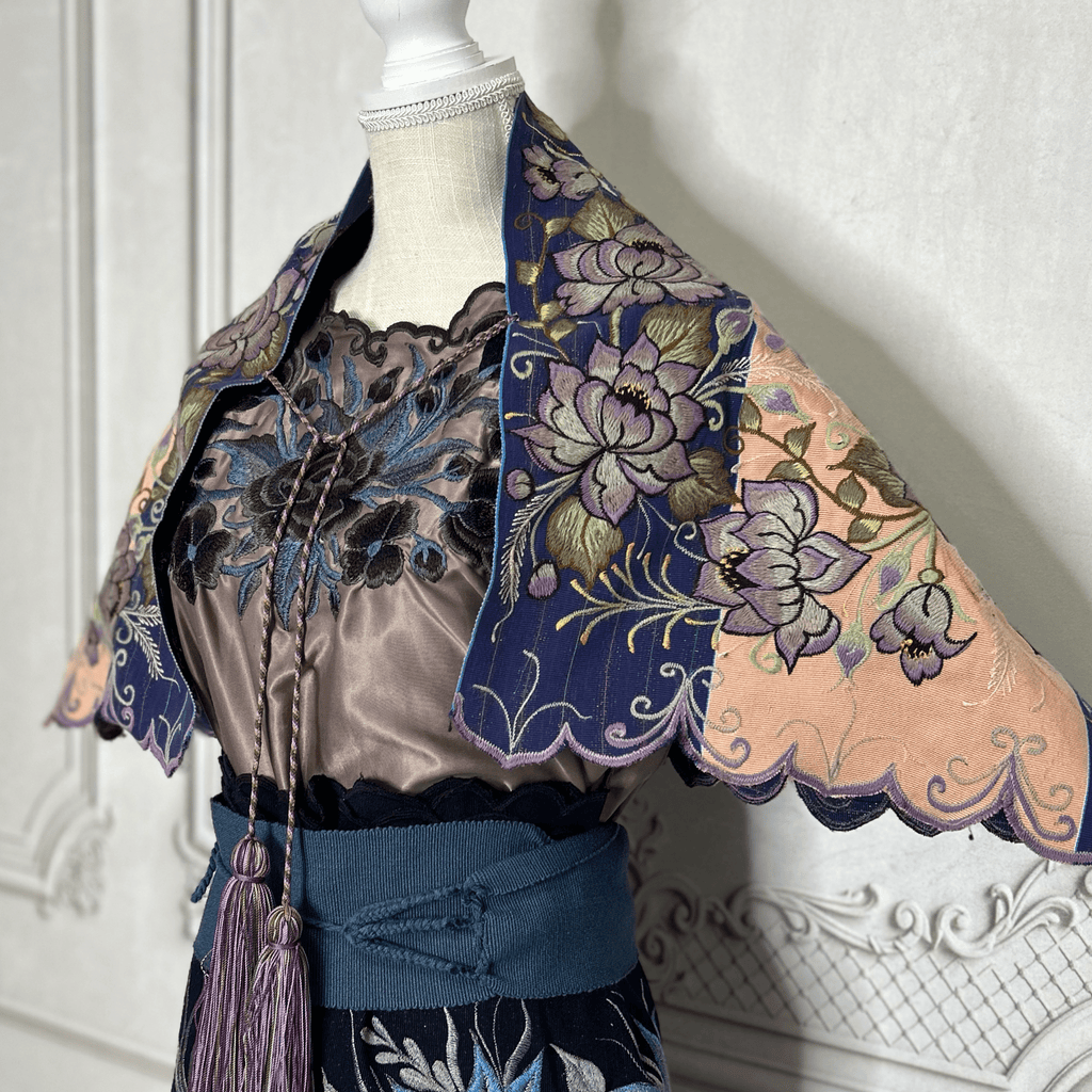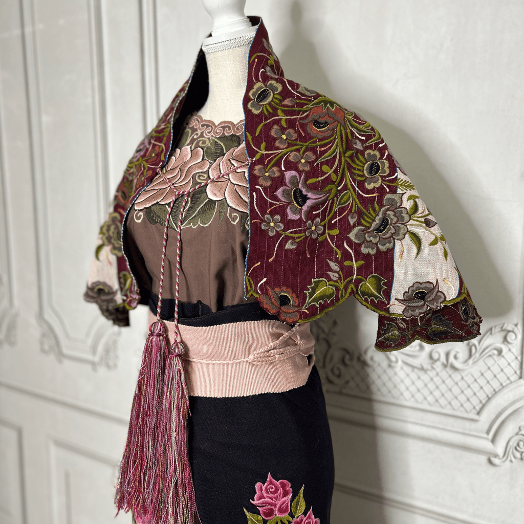 -La cape passe sur l'épaule et se noue devant avec de magnifiques pompons en satin.