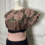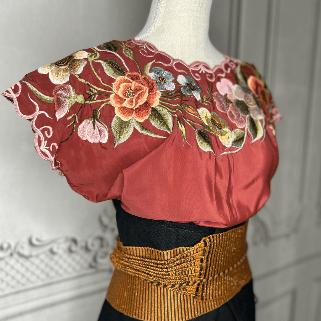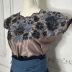 -La blouse est en satin avec des broderies autour du cou, devant et dos