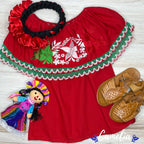 Parfait pour Cinco de Mayo ou la célébration du jour de l’indépendance mexicaine. Notre chemisier Viva Mexico à épaules dénudées est confortable et composé à 100 % de coton avec une broderie frontale en soie. La taille élastique tout autour vous offrira un ajustement parfait. Ruffle a un treillis tricolore avec de la dentelle détaillée tout autour.