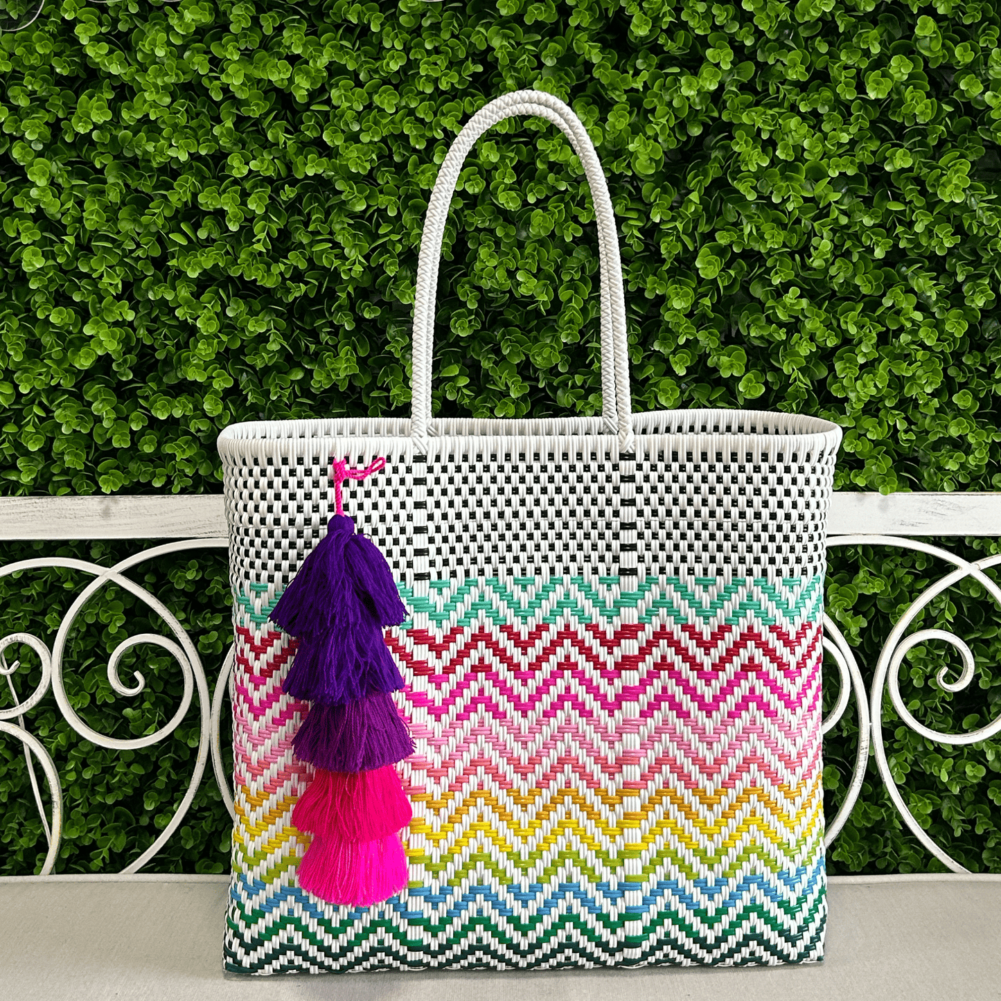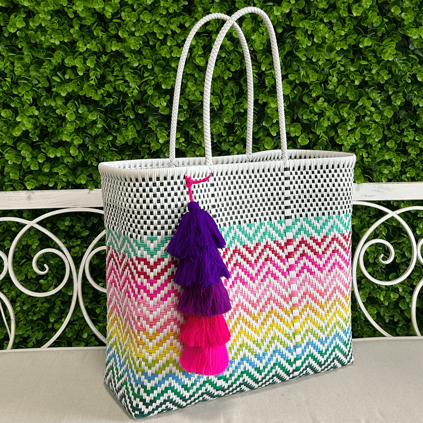 Introducing our Upcycled Handwoven LG Tote, crafted with traditional methods from repurposed plastic. Featuring sturdy plastic straps, it's the perfect beach tote.