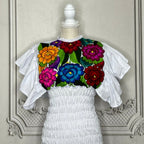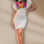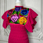La robe parfaite pour mettre en valeur vos courbes ou votre baby bump. Cette robe mexicaine est brodée à la main sur du tissu élastique. Épouse votre corps aux bons endroits avec de jolies manches à volants.