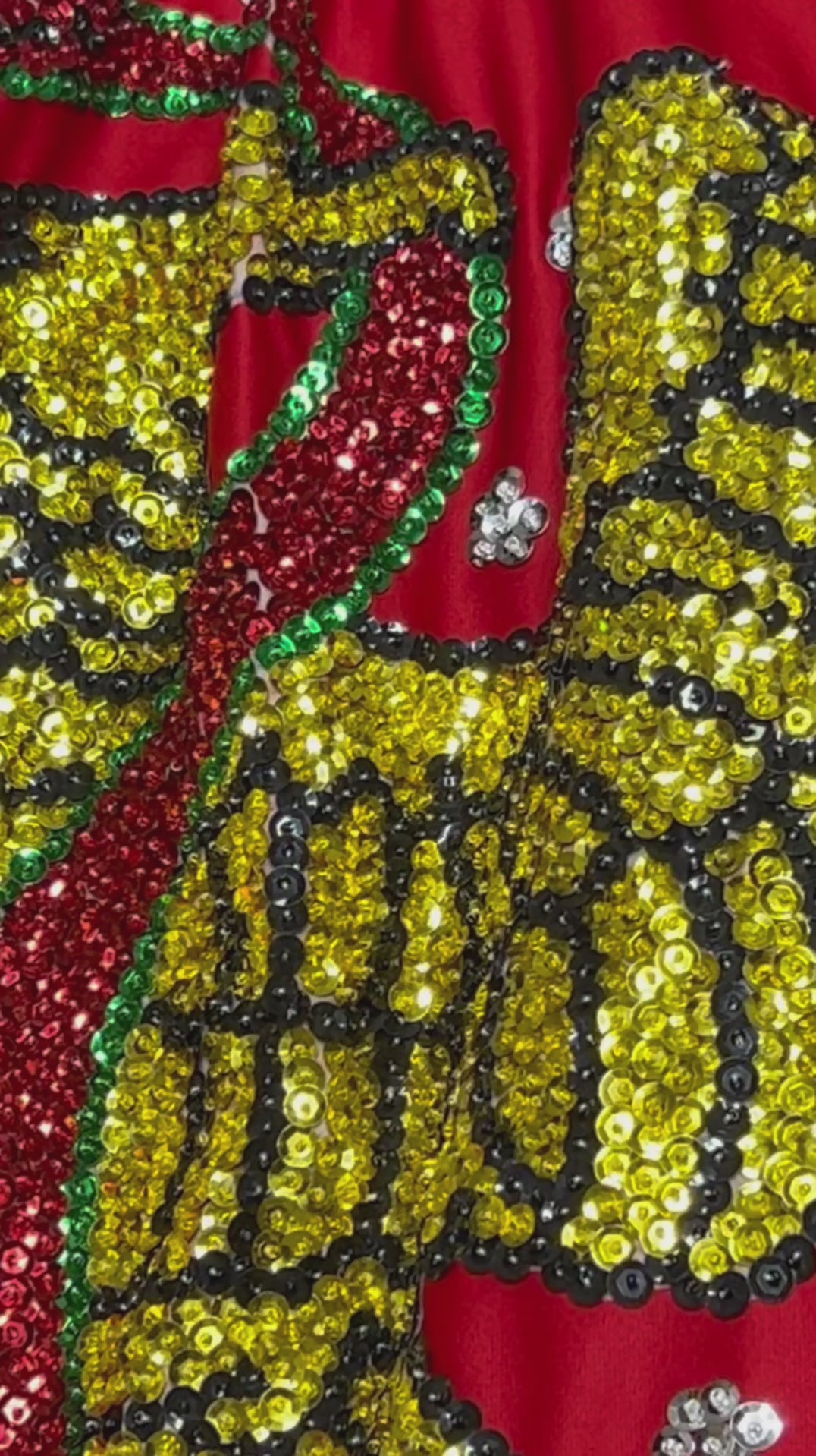 The outfit is handmade by the artisans of Puebla. The blouse is hand embroidered with plastic beads at the neckline, and the skirt is hand embroidered in sequence, piece by piece. Depending on the design, it takes 2 months to a year to finish an outfit.