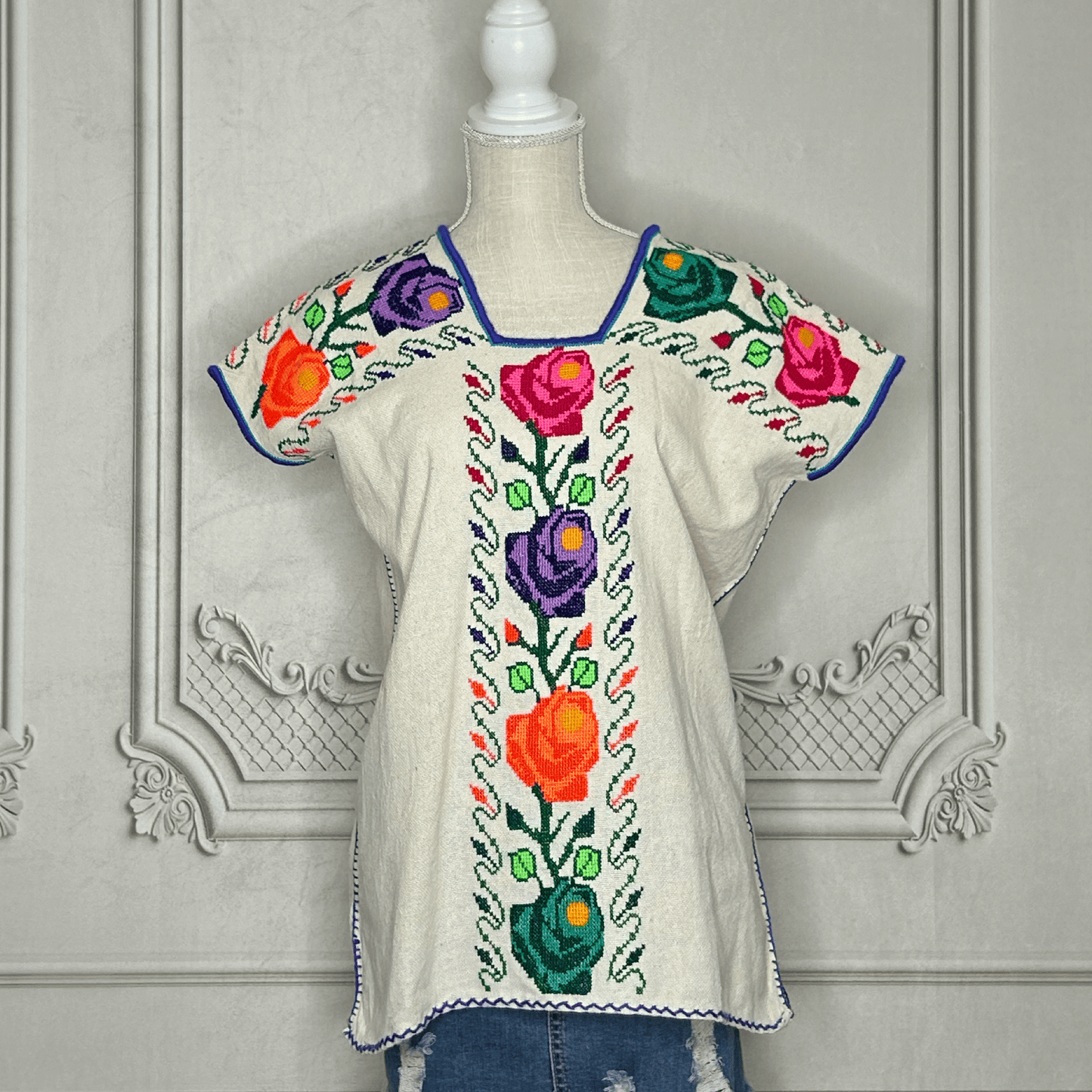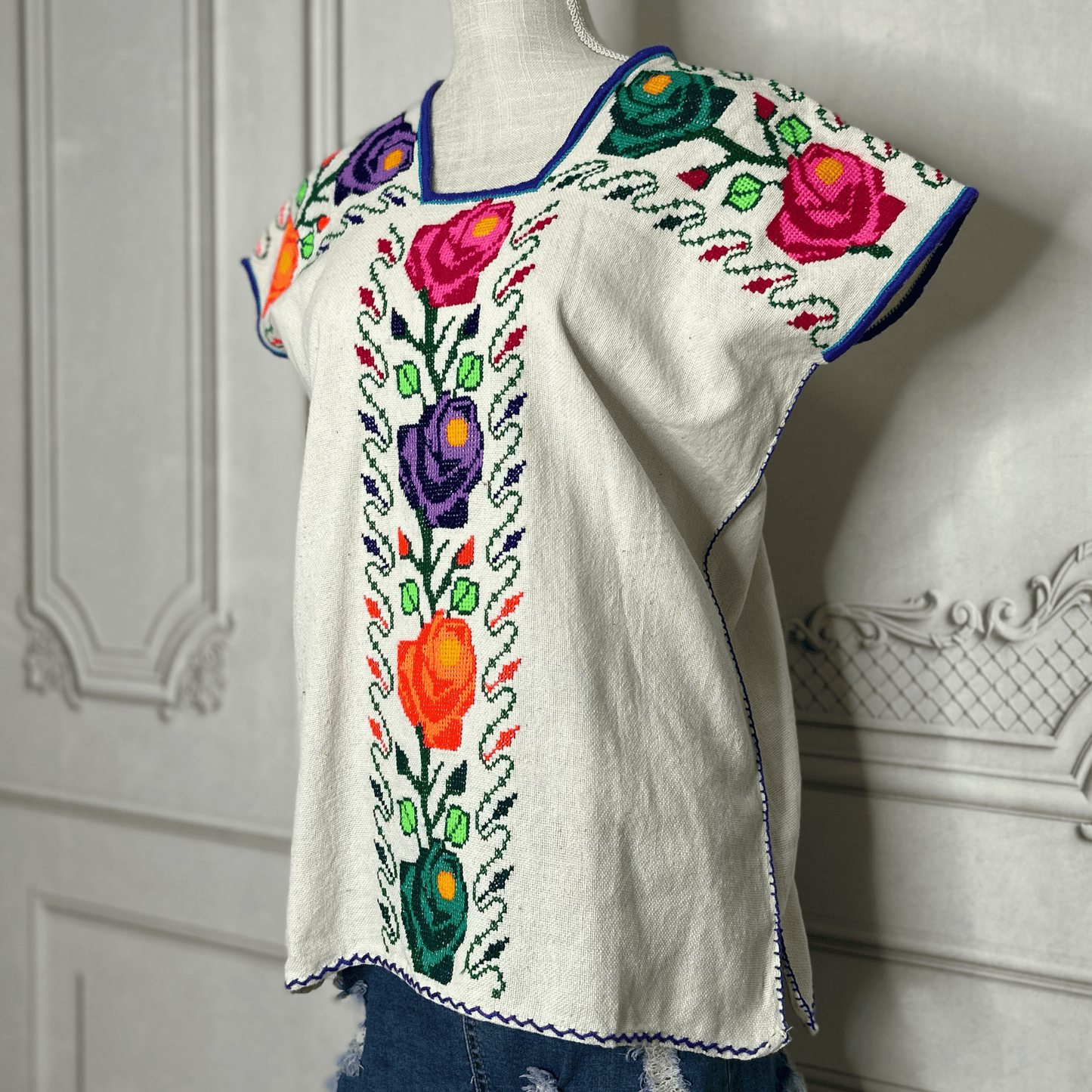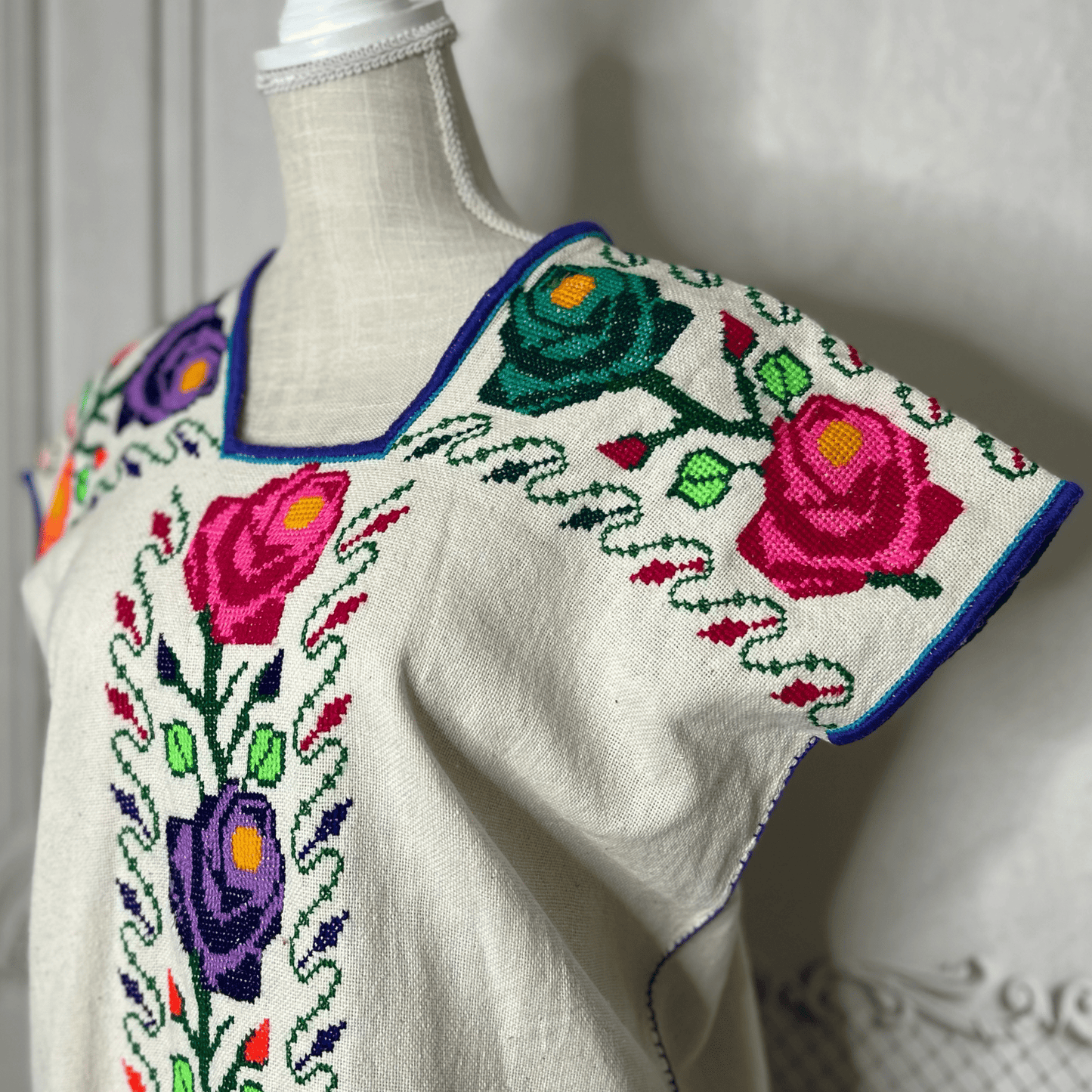 This unique Huanengo from Muchoacan Huipil Blouse is crafted from 100% cotton and boasts a stunning hand-made stitch design in a beautiful array of colors. Expertly woven on a rustic loom by master weavers in Michoacan, each garment is carefully crafted and takes approximately 4 days to complete. The artisanal pigmentation adds a special touch to the fabric, making each meter a work of art.
