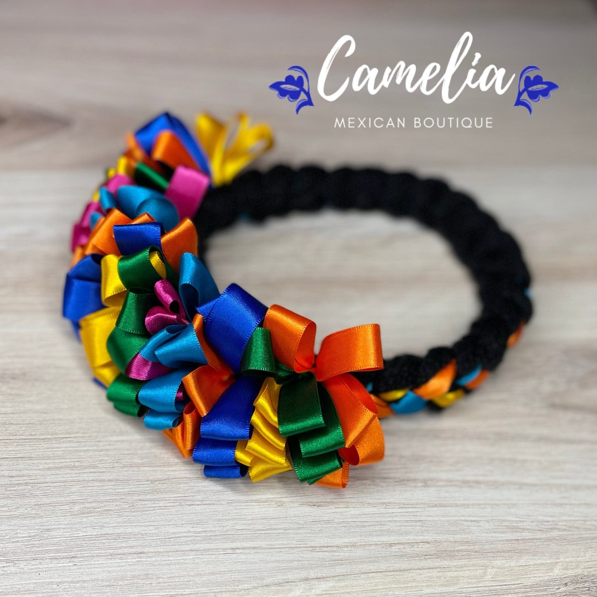 Mexican Headband made by hand in a braided yarn and satin ribbon.