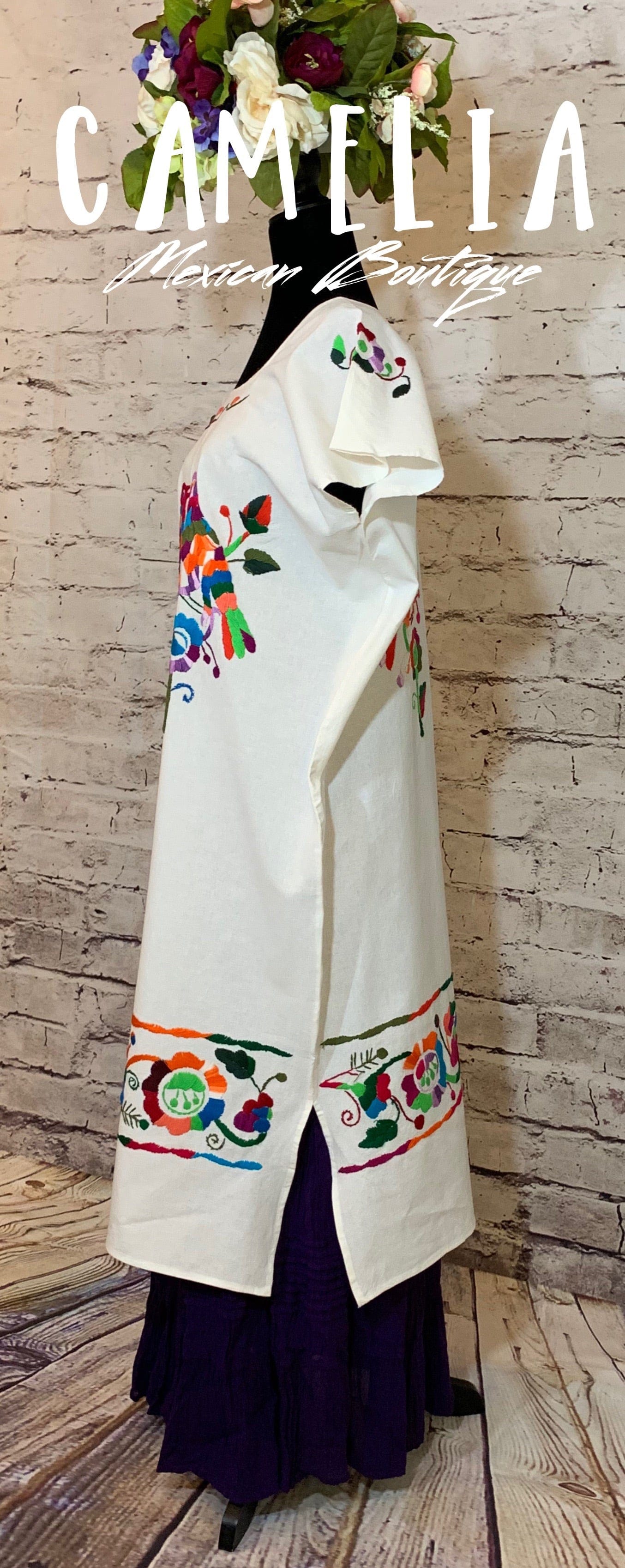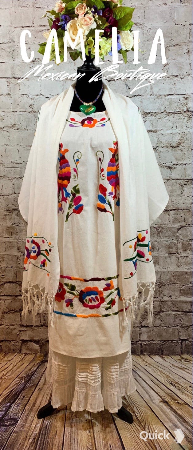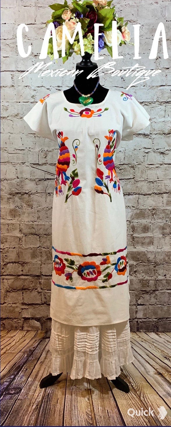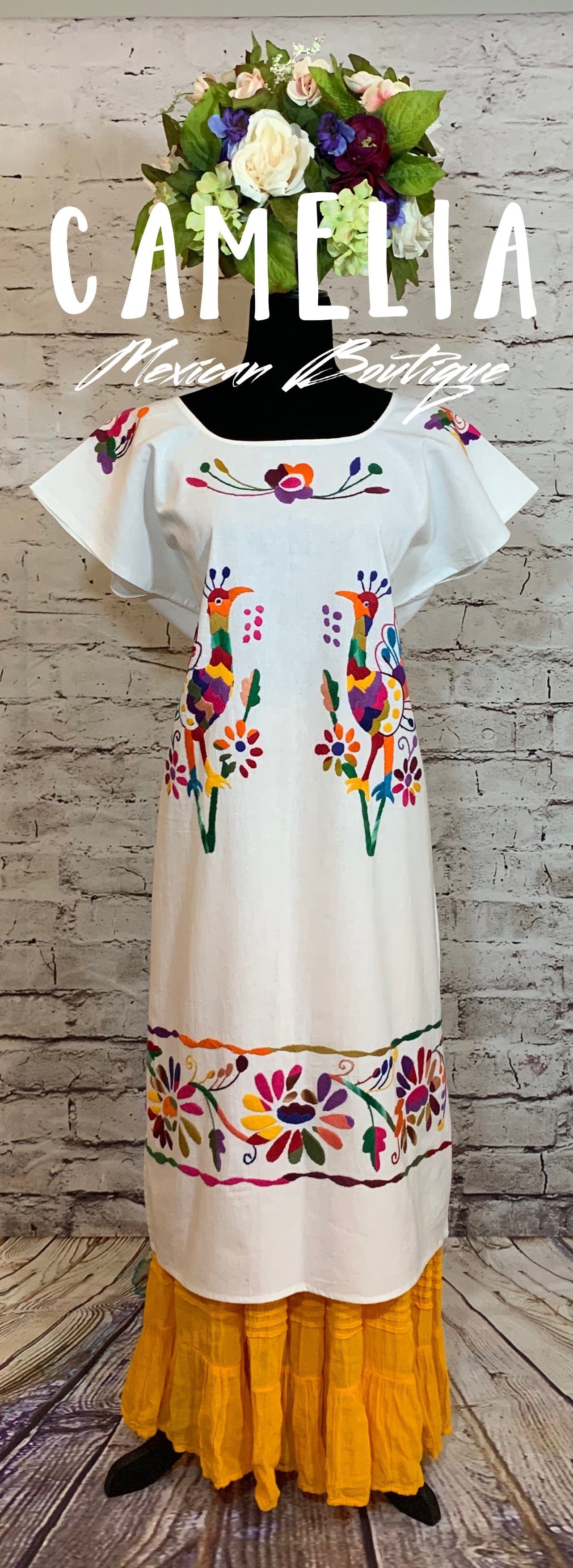 Handcrafted from raw cotton (manta), the Paradise Huipil Dress features a delicate bird motif expertly embroidered with fine thread. Purchase the coordinating embroidered shawl or pair with a silk shawl for a versatile look. To add extra length, pair with a gauze skirt (sold separately).