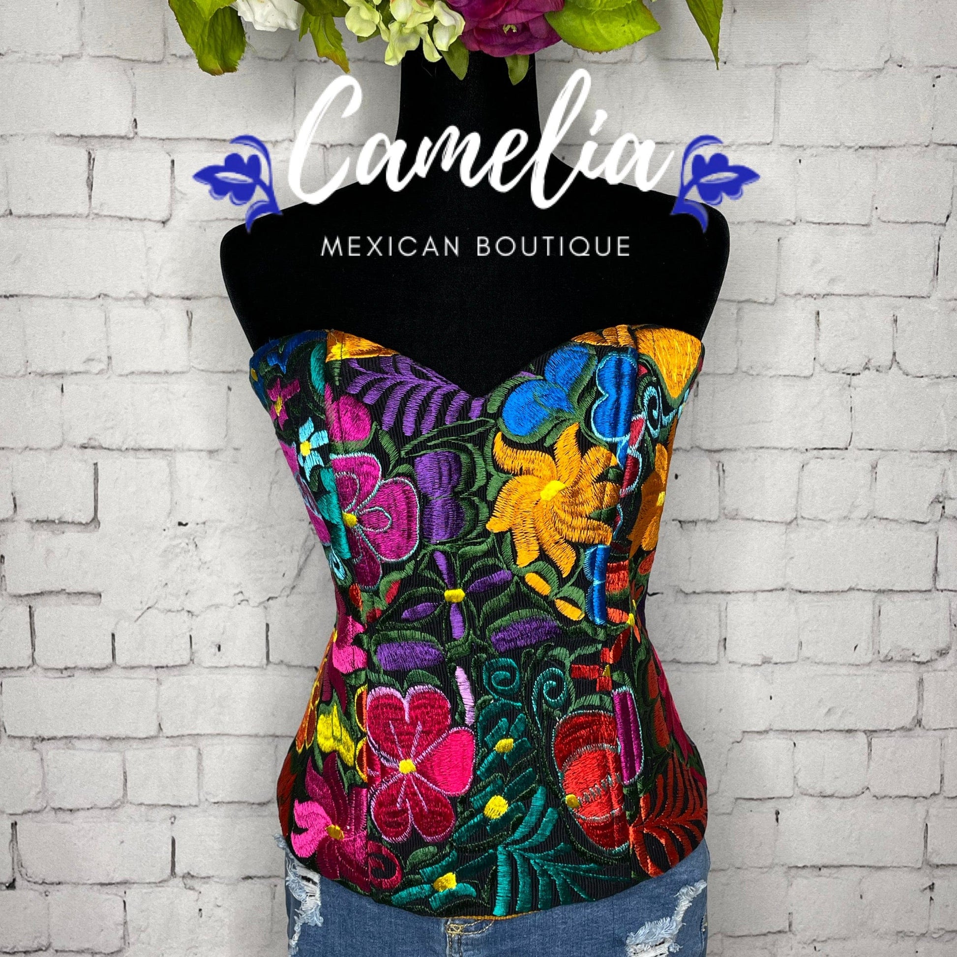 This beautiful corset is the perfect piece for that special event. You can dress it up or down. Handmade and embroidered by Artisan Women of Chiapas. Each piece has a unique embroidery pattern in silk thread. The inner lining and back are made of satin fabric with a laced-up back. The width is adjustable by 3 inches. Pair it up with a matching clutch.