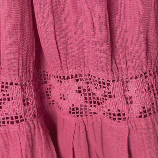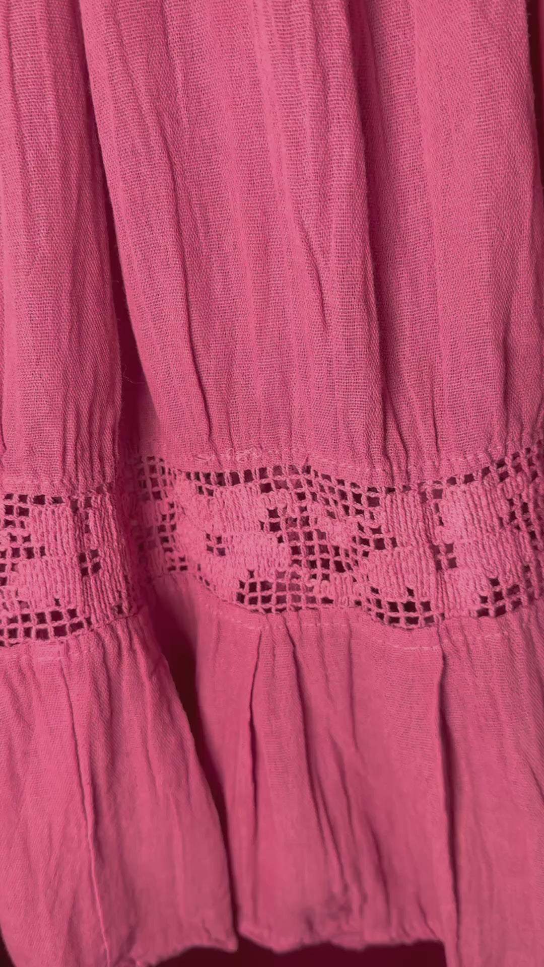 Crafted from soft, breathable 100% cotton gauze, this hand-dyed skirt features beautiful crochet lace panels that add texture, charm, and a touch of traditional artistry. Its gathered waist creates a comfortable, flowy silhouette, while the tiered design gives it effortless movement with every step.