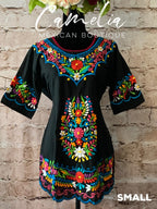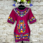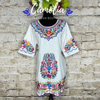 Cute Mexican Mini Dress with a detailed flower silk embroidery. Embroidery detail around sleeve, hem line and frontal floral design. With tie back for a perfect fit. Made of 100% cotton, manta (Musin) fabric.