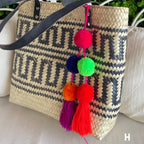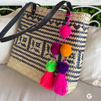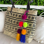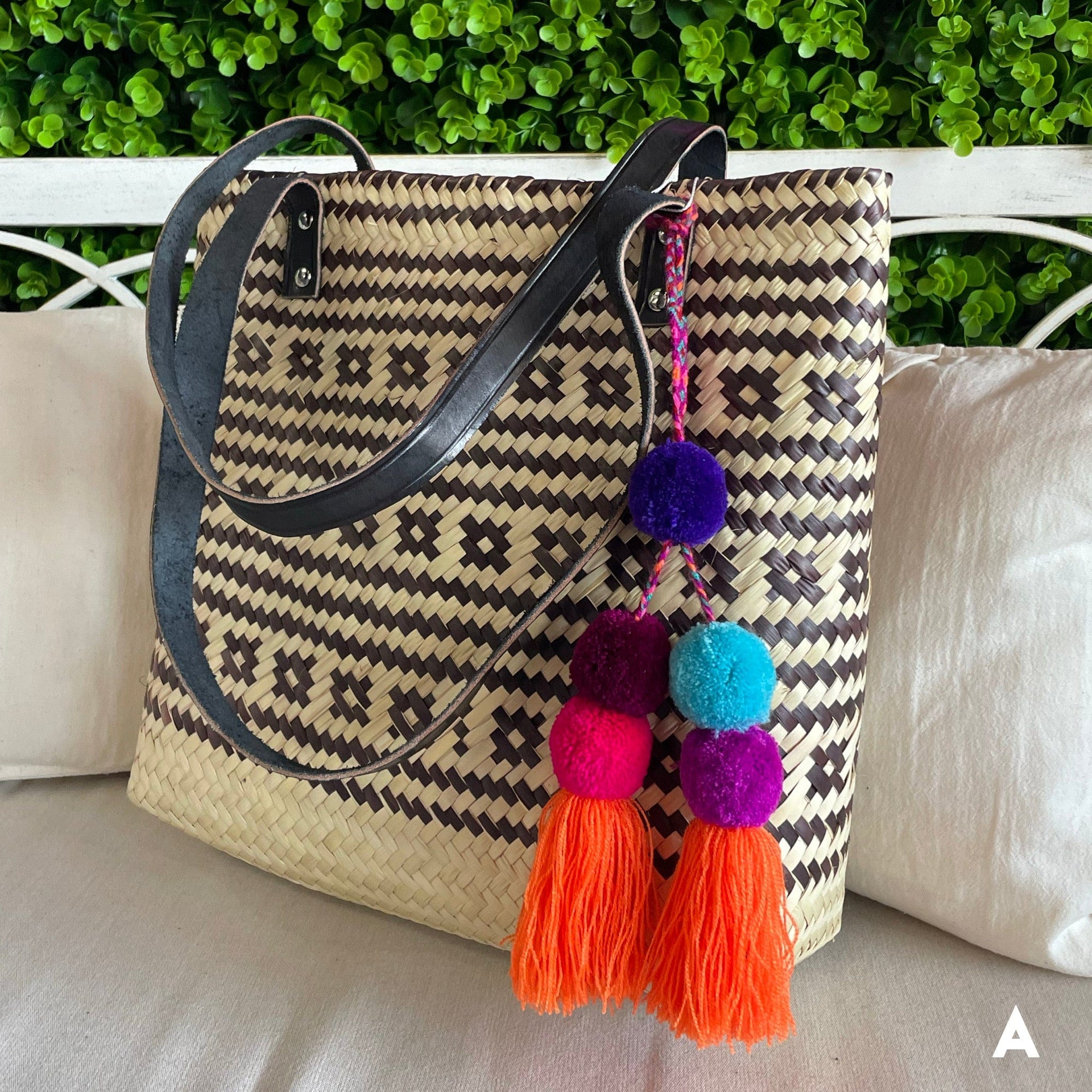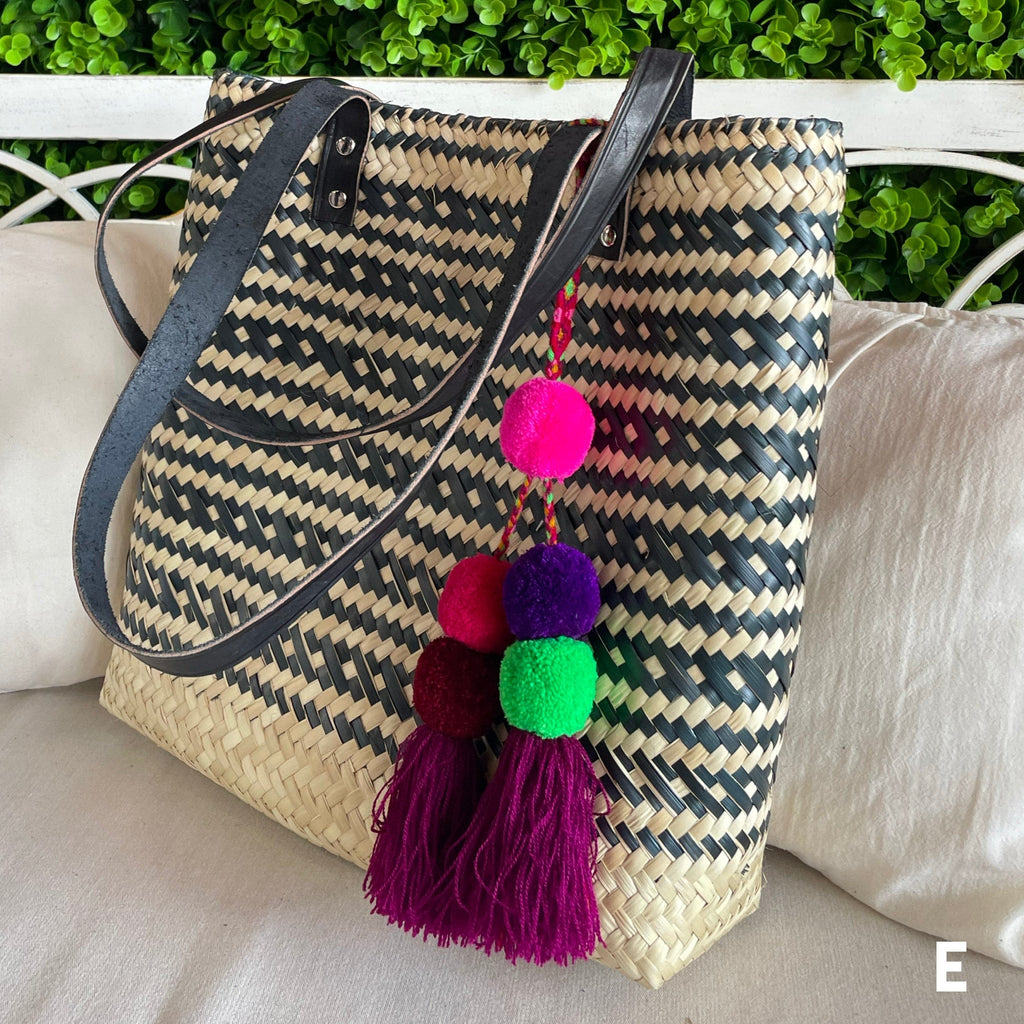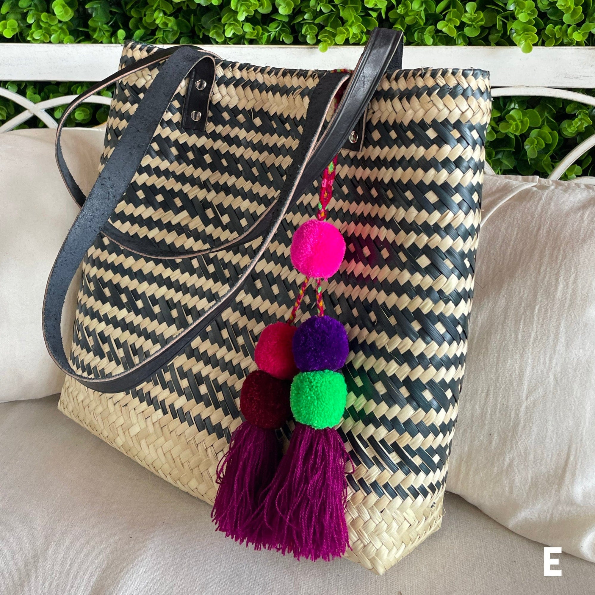 Eco-friendly and sustainable hand-woven palm leaf tote bag with leather straps and cute tasseled pompom. Straps are long enough to use as a shoulder bag.