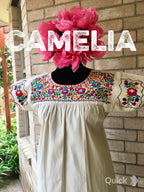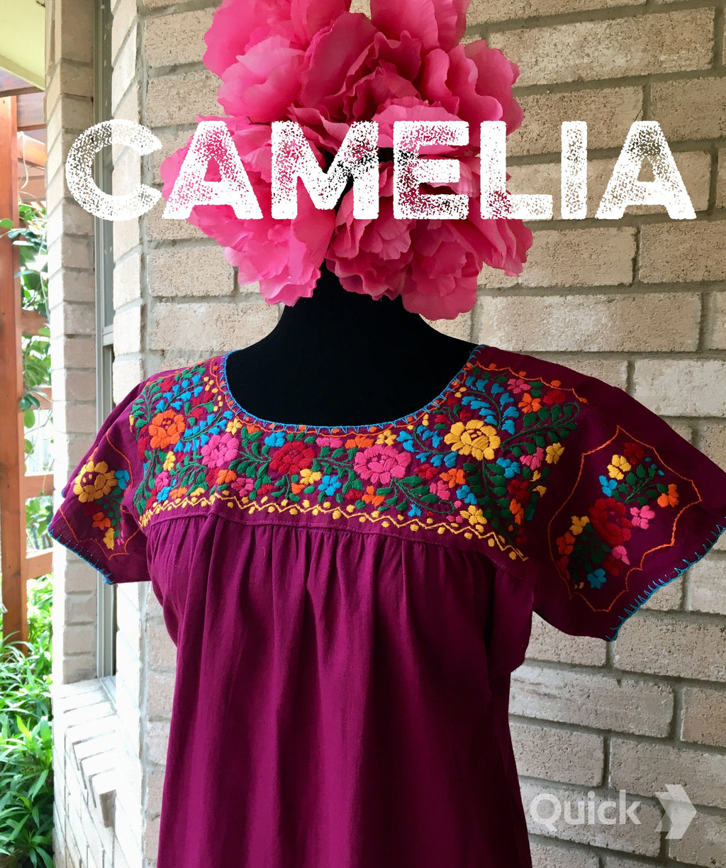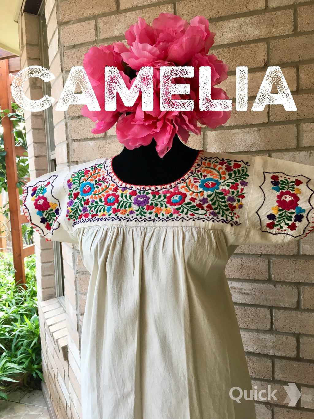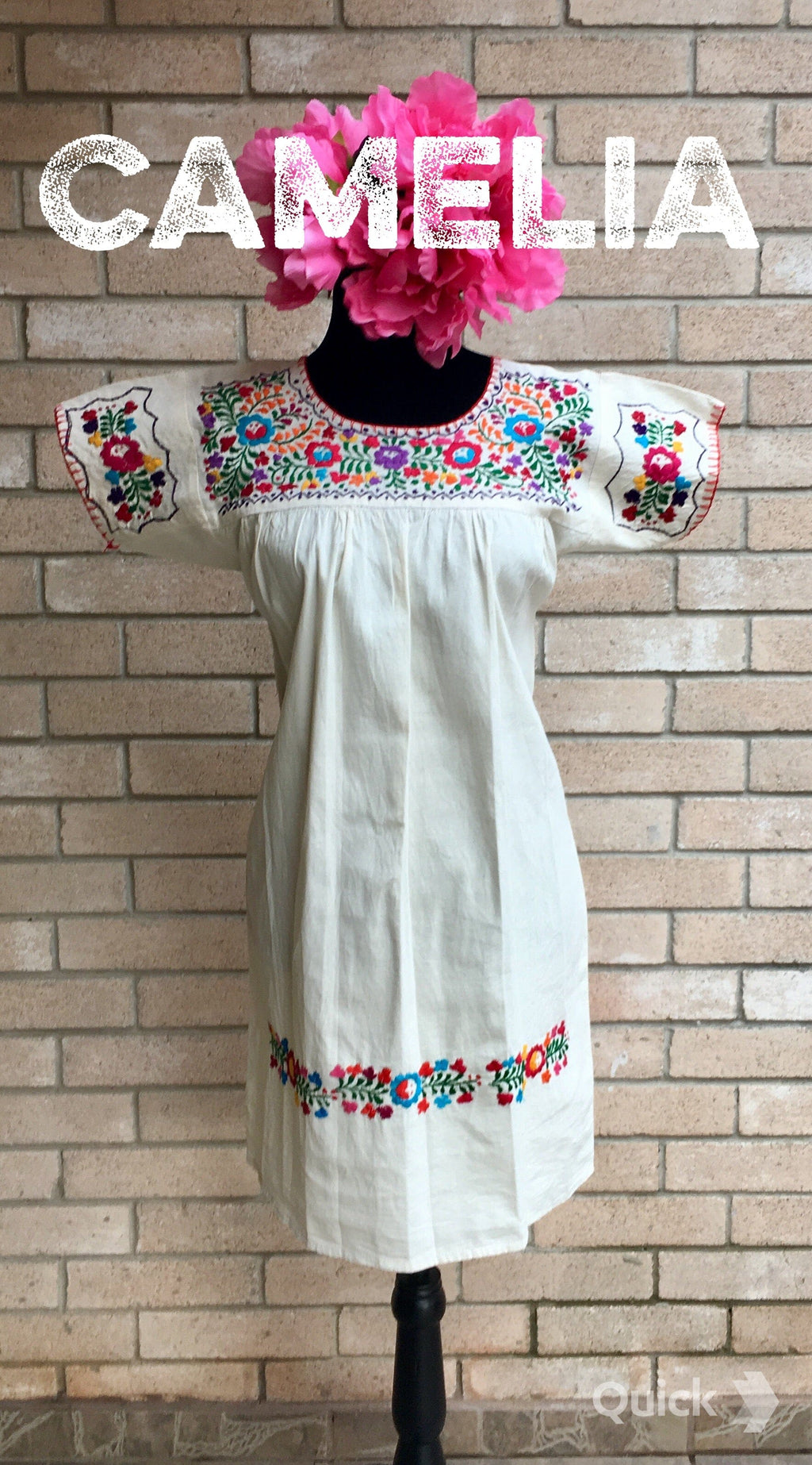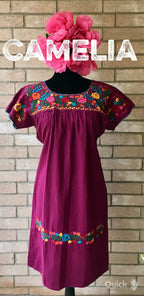 Gorgeous Tehuacan dress hand embroidered in multi-colored thread on raw cotton fabric (manta). Available in plum and ivory. Pair it up with one of our hand made painted seed necklaces.